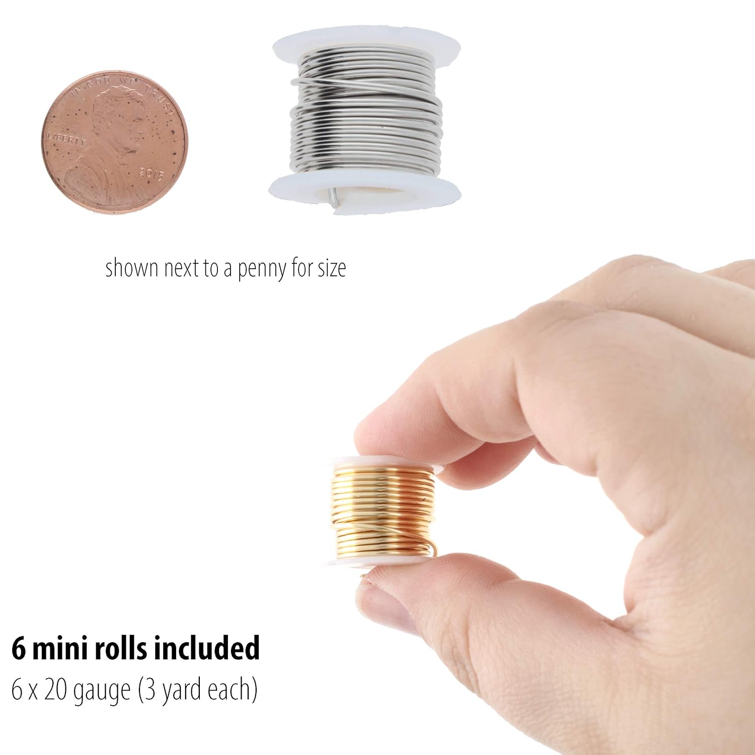 - INCLUDES: This assortment pack of medium temper wire contains six 0.75" (2 cm) mini spools, each containing 3-yards (2.7 m) length of craft wire. It includes 1 gold color, 1 silver color, 1 copper color, 1 rose gold color, 1 vintage bronze color, and 1 antique copper color. Each bobbin of wire is 20 gauge.