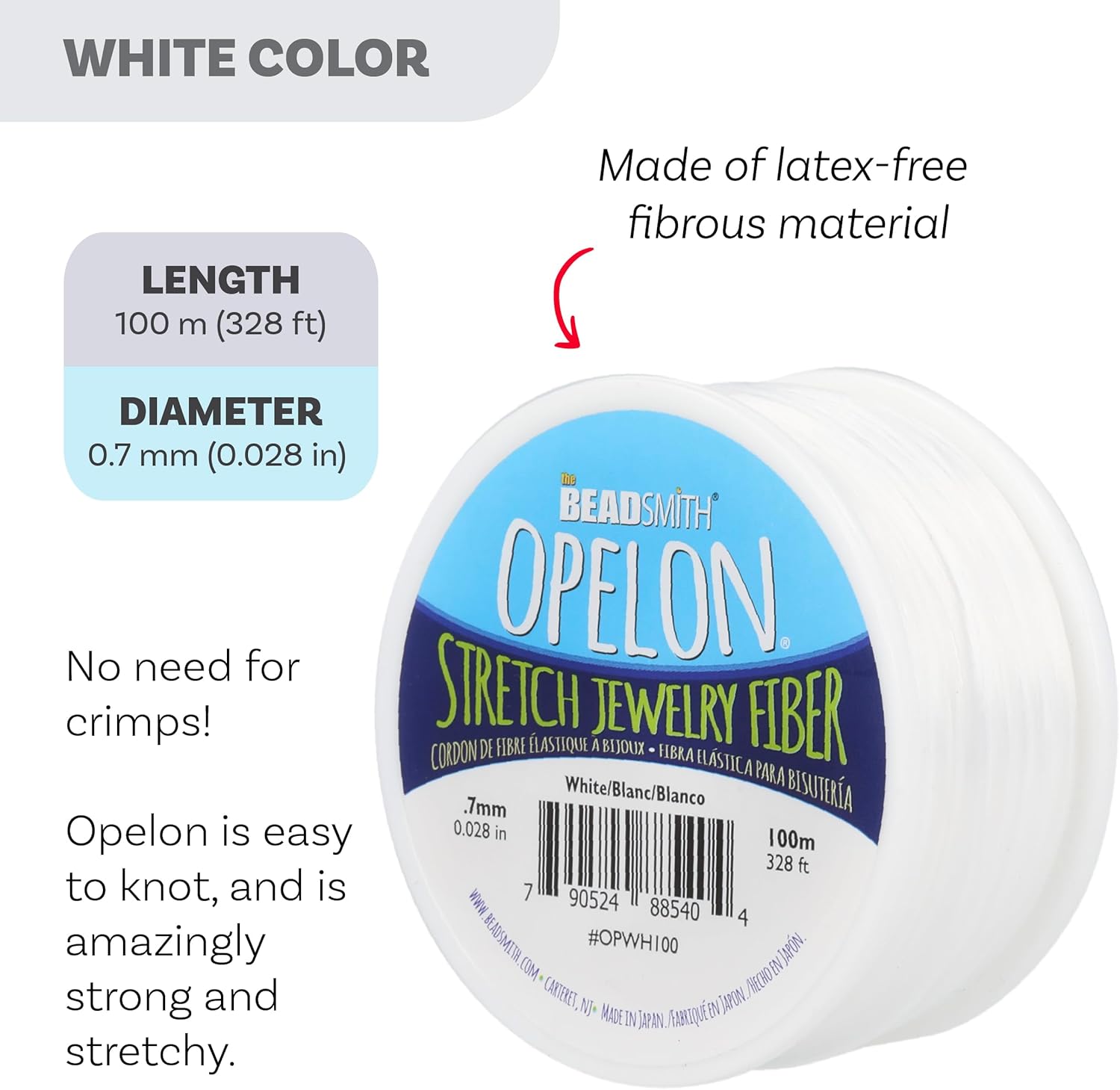 - OPELON FIBER: This stretchy jewelry string is made of a white fibrous material and measures 0.7 mm in diameter. The 100 meters are wound on a spool that is secured with a clear plastic clip to keep your cord secure and organized.