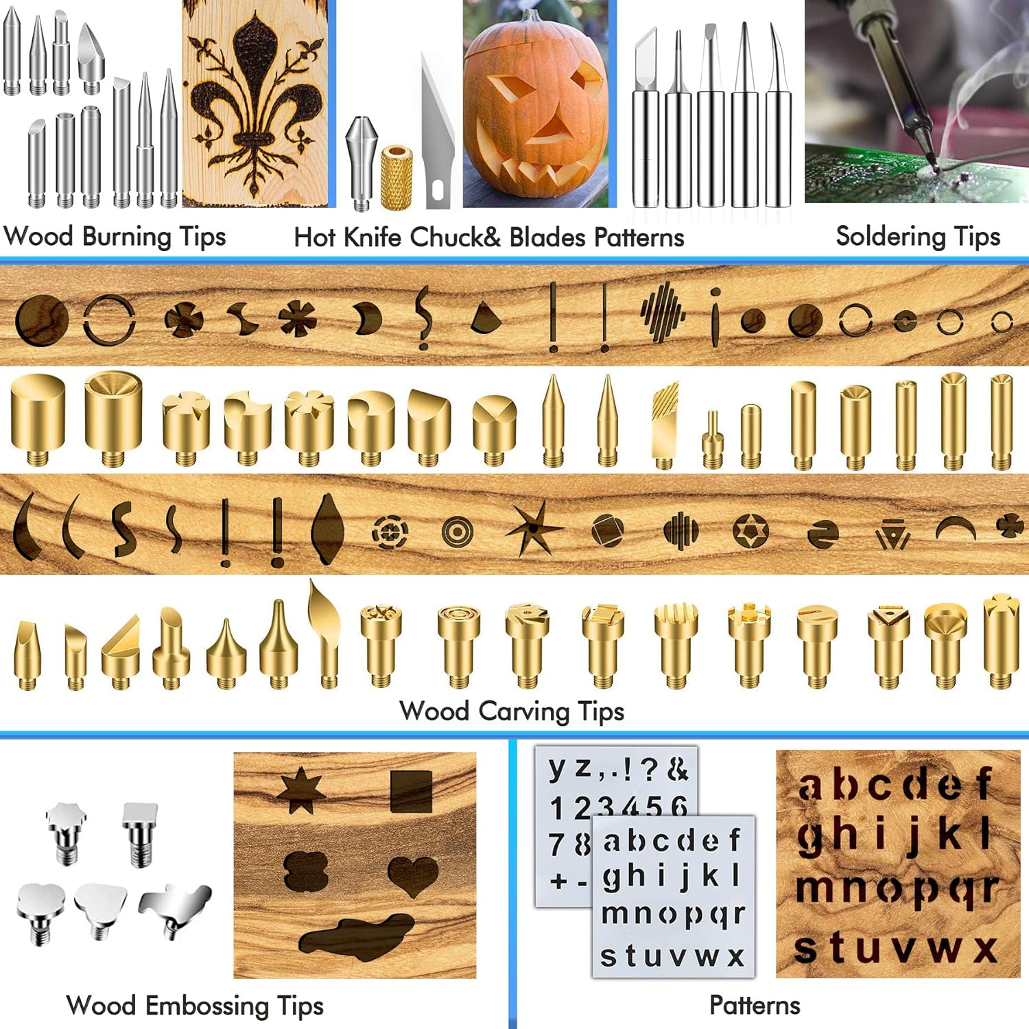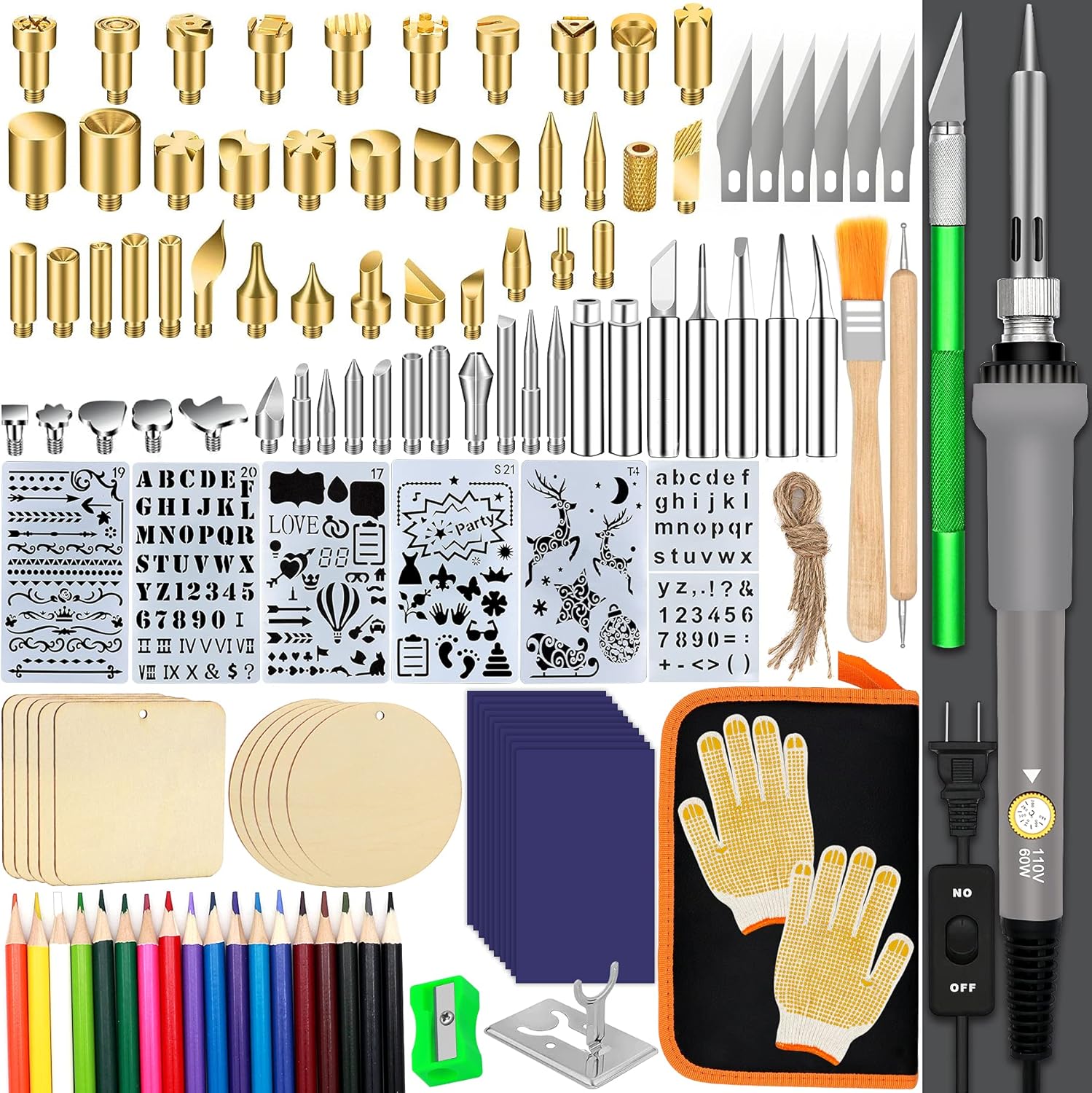 - MULTIFUNCTIONAL USE: The set includes quantity different wood burning tip accessories, templates, wood clices, pencils, gloves, carving on leather, wood, soldering circuit boards. Can be easily used for wood burning beginners