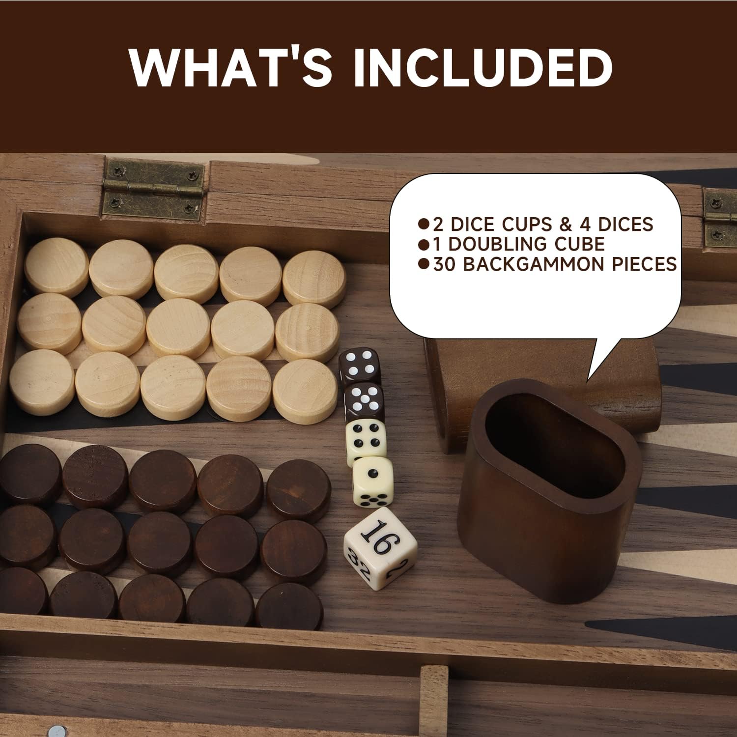 - Complete Set: The wooden magnetic backgammon set includes a backgammon board game case, a complete set of 15 milky white and 15 coffee color magnetic backgammon game pieces, two wood dice cups, two pairs of dice, a doubling cube, and game instructions