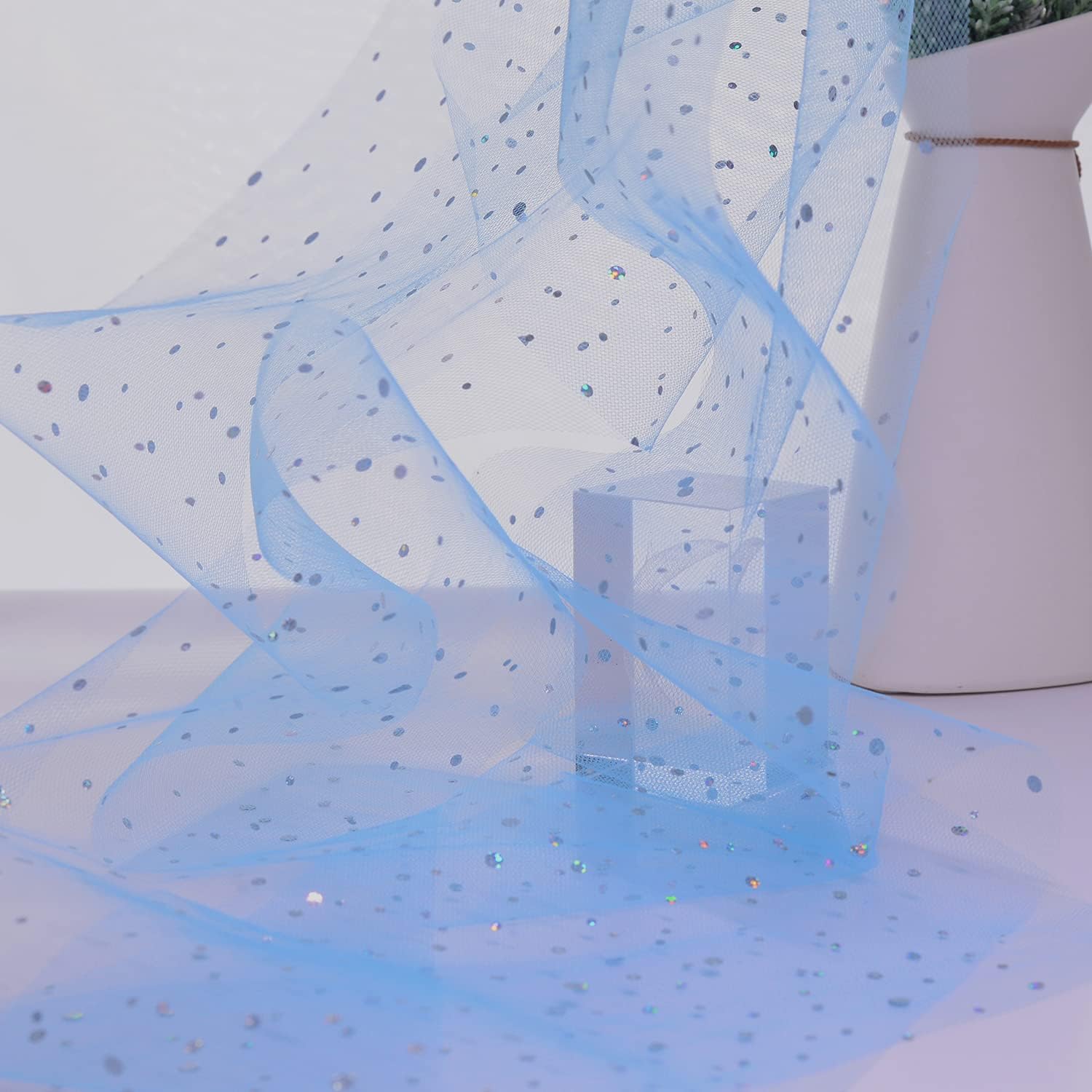 - 🎀【Premium Material】Made of 100% Soft Polyester, flexible diamond netting, lightweight / fine glitter tulle bolt, The fabric is easy to shape and use. Just cut the length you want to decorate. Tulle doesn't require stitching or finishing, it won't unravel!