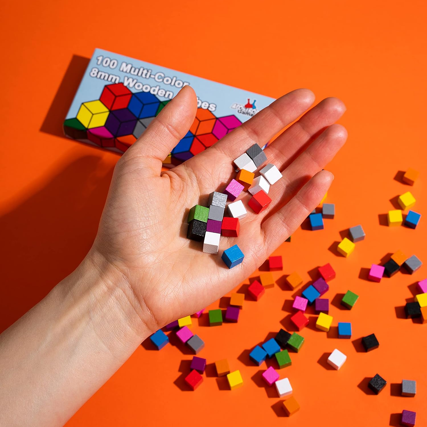 - 100 multi-color wooden cubes (8mm) and reusable box