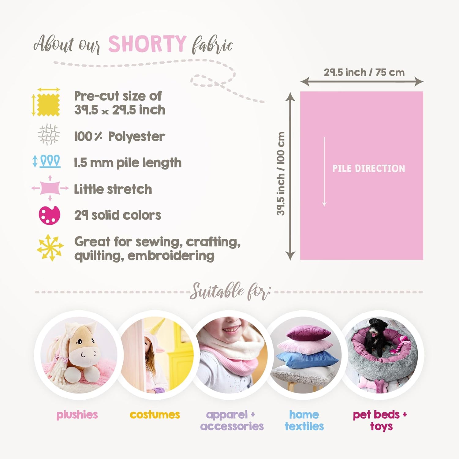 - High-quality plush material: Pre-cut, slightly stretchy minky fabric made from 100% polyester microfiber with a size of 39.5x29.5 inch (100×75 cm). Our fuzzy, durable & easy-to-sew plush fabric retains its comfort, softness and vibrant color even after multiple washes, ensuring long-lasting quality.