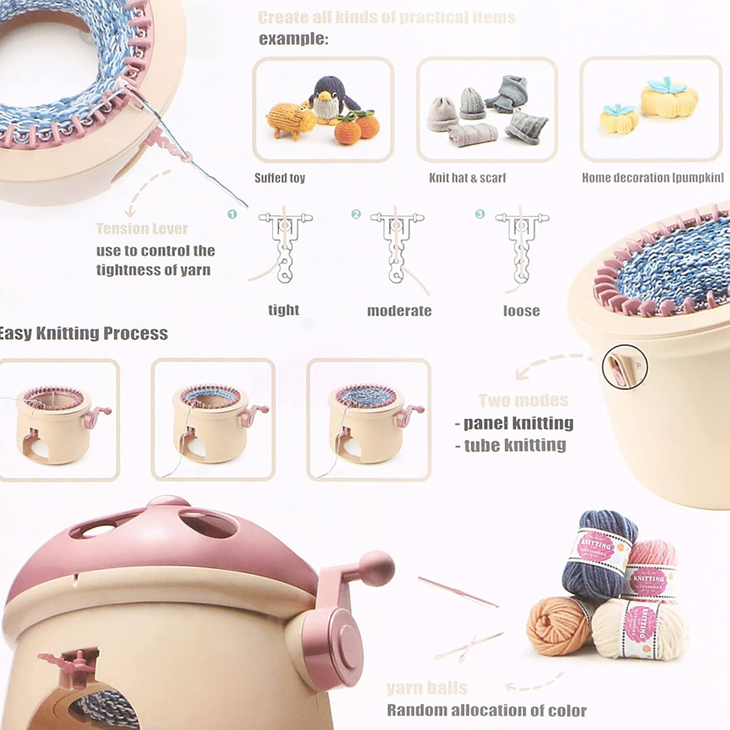 - 【Fast Knitting and Save time】 With or without experience. This knitting kit machine can help you easily and quickly knit your own cool fashion accessories, such as hats, scarves, socks and present them to your parents and friends.