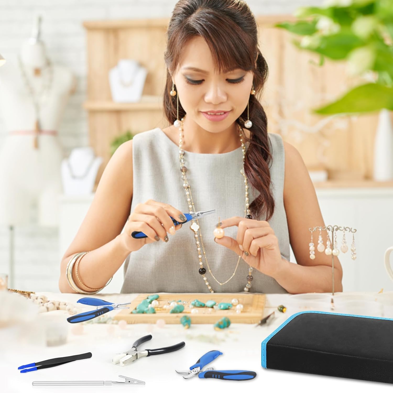 - 【Jewelry Pliers Set】The jewelry making kit comes with 7pcs jewelry making pliers, jewelry tweezers, jewelry wearing helper hand and storage bag. The jewelry pliers are designed in various shapes and functions, such as Chain Nose Pliers, Bent Nose Pliers, Round Nose Pliers, Flat Nose Pliers, Wire Cutter Pliers, 6-step Bail Making Pliers, Nylon Jaw Pliers, ideal for jewelry making, jewelry repair, wire wrapping, jewelry making supplies and other DIY crafts.