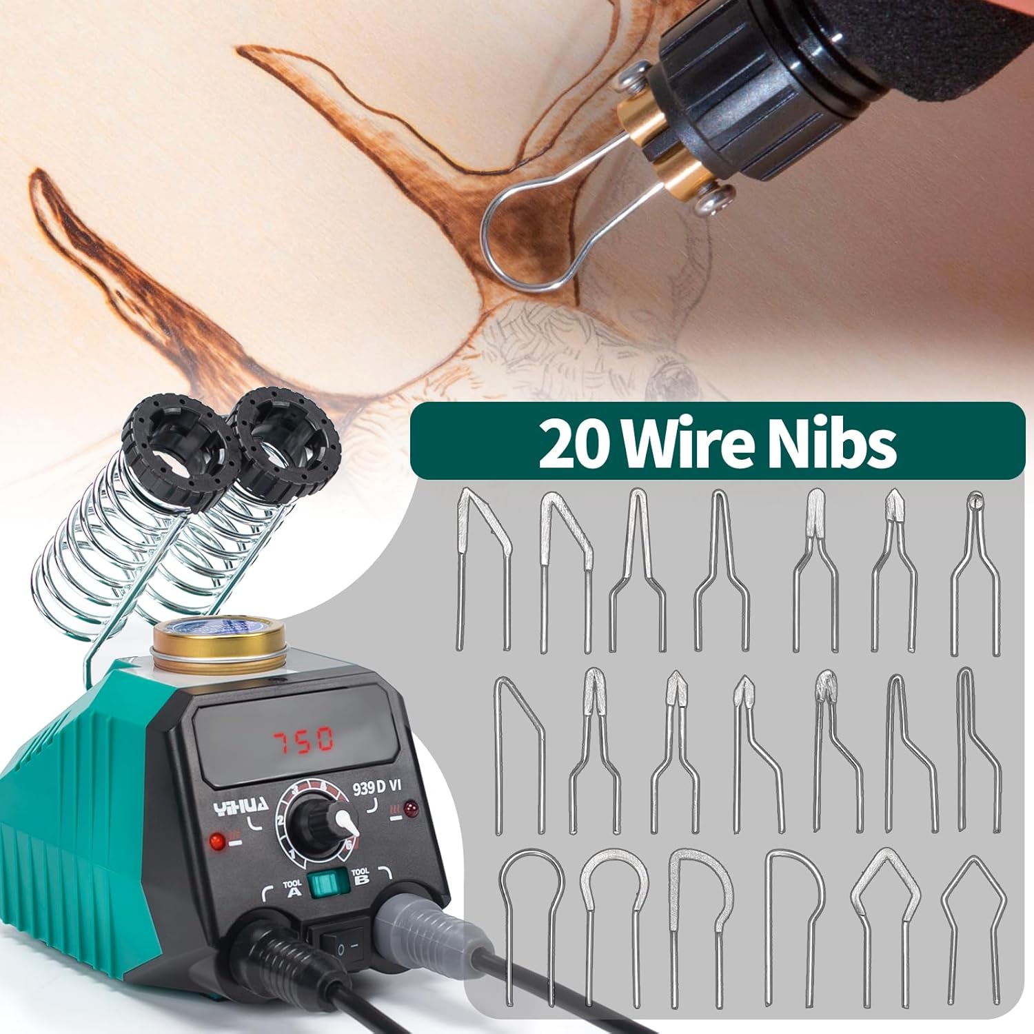 YIHUA 939D-VI Dual Pen Wood Burning Kit with Digital Display with 20 Wire Nibs, Detachable Wood Burning Pen, 2 Wood Pieces, Tweezers Used as Wood Burning Tool