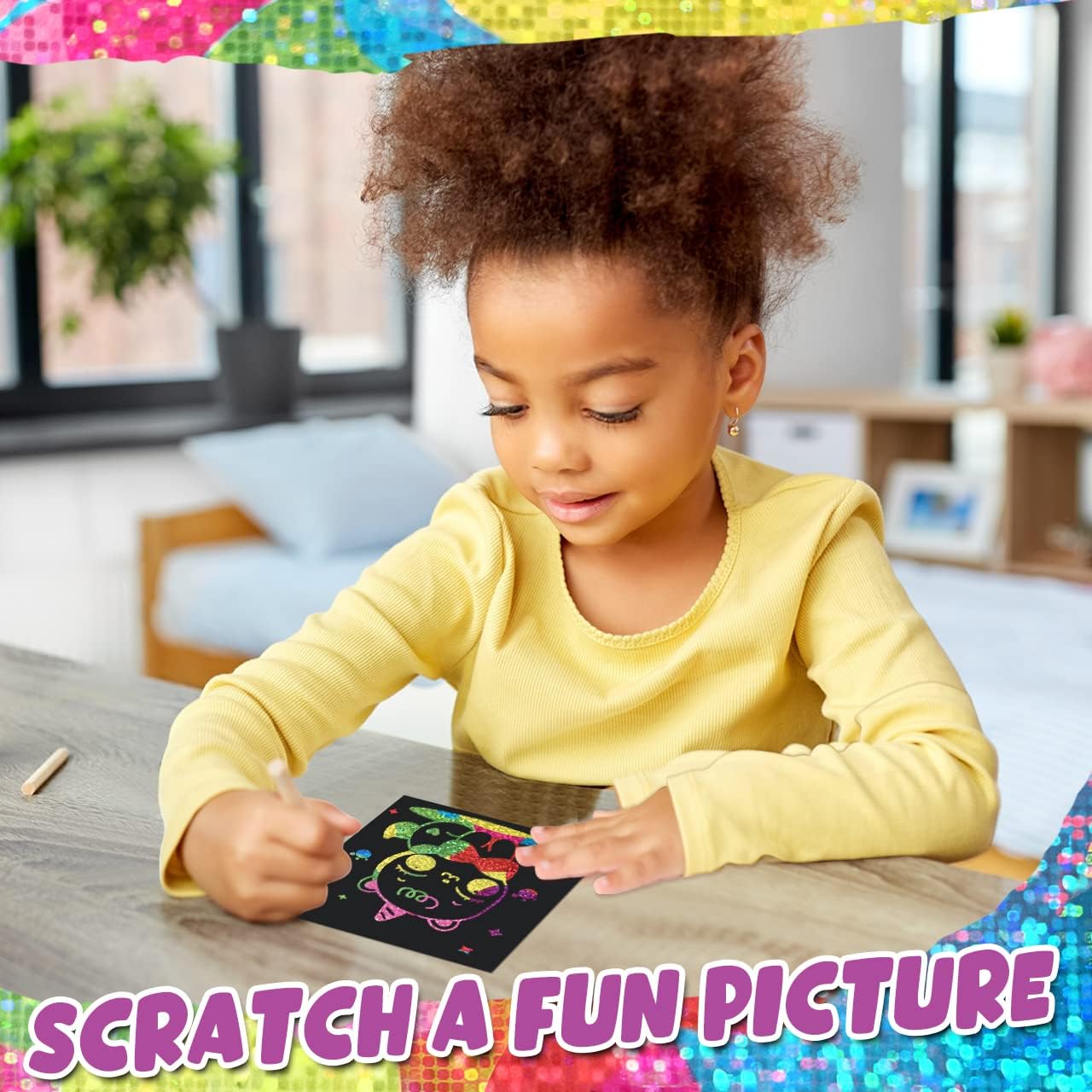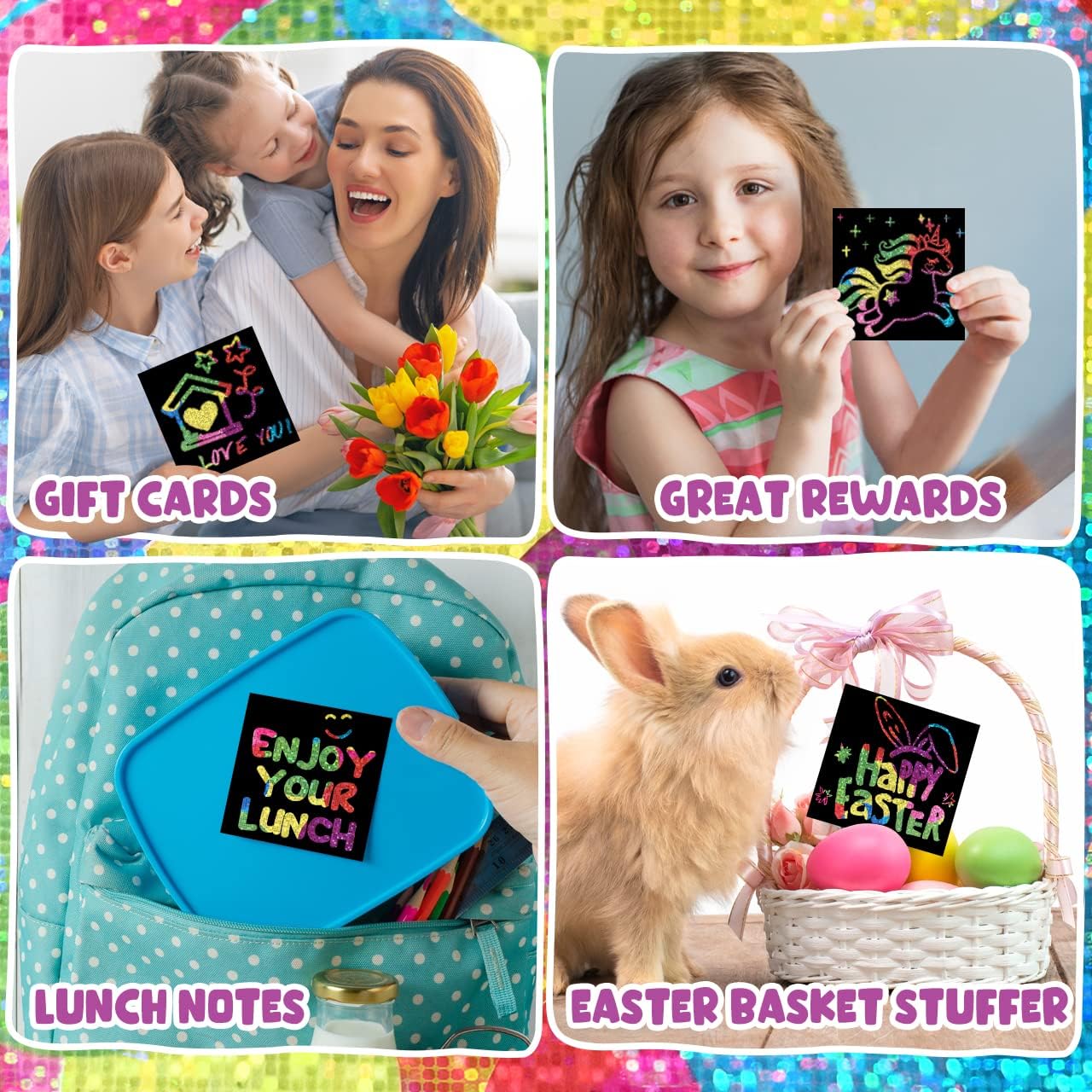 - Create Sparkling Amazing Artwork: The rainbow scratch art notes is covered with rainbow glitter holographic layer. Just scratch away the black matte surface and the holographic materials will flash different dazzling colors and luster at different angles under the sun or light. This scratch paper art let kids take the time to play, think, and create their masterpieces