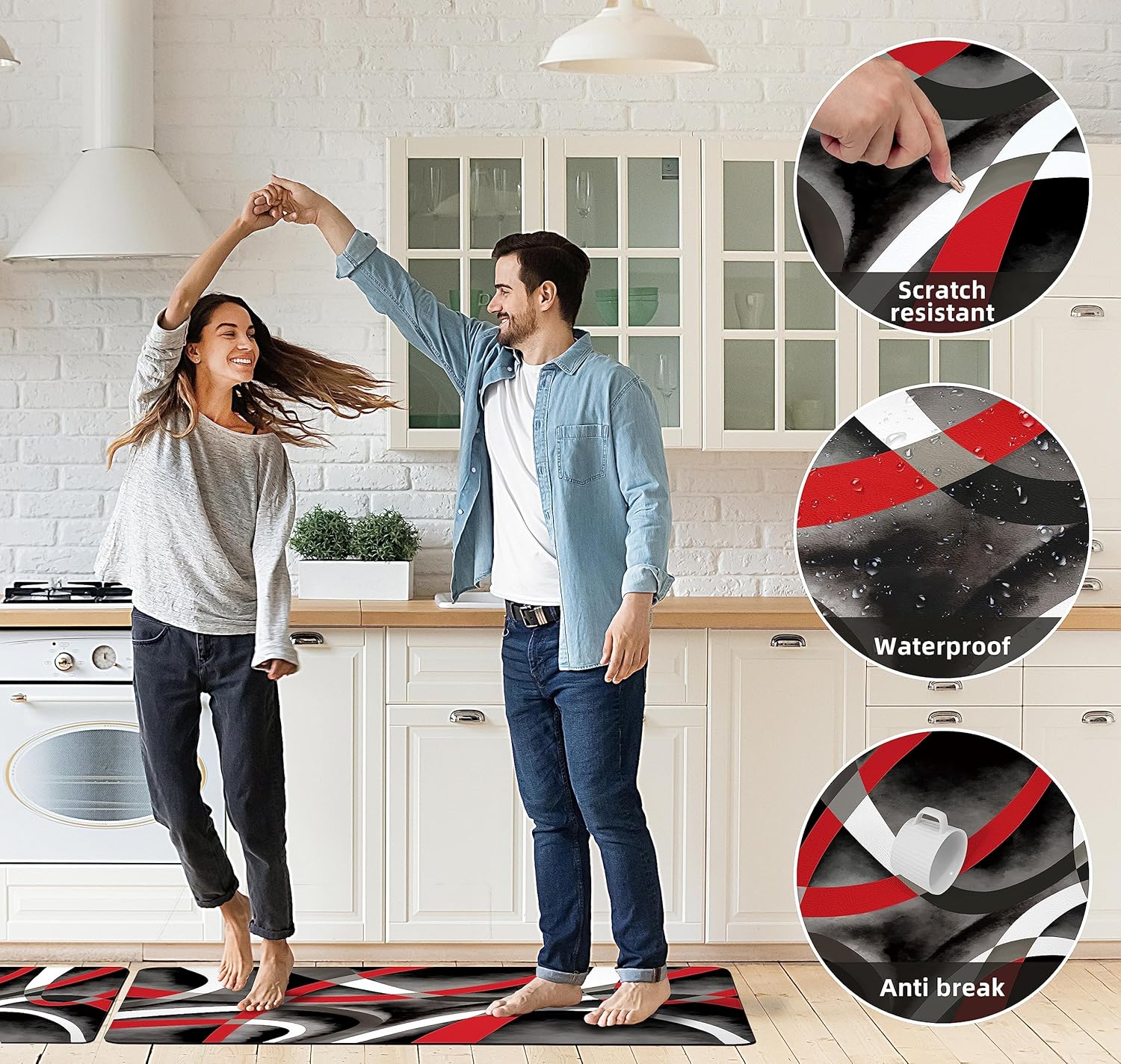 - Kid and Pet-friendly: These red and black kitchen rugs are kid approved and pet friendly. The non-skid kitchen mats for floor are designed with advanced beveled edge and non-slip backing that make the mat keeps in place well, helping to protect you from slippage and tripping.