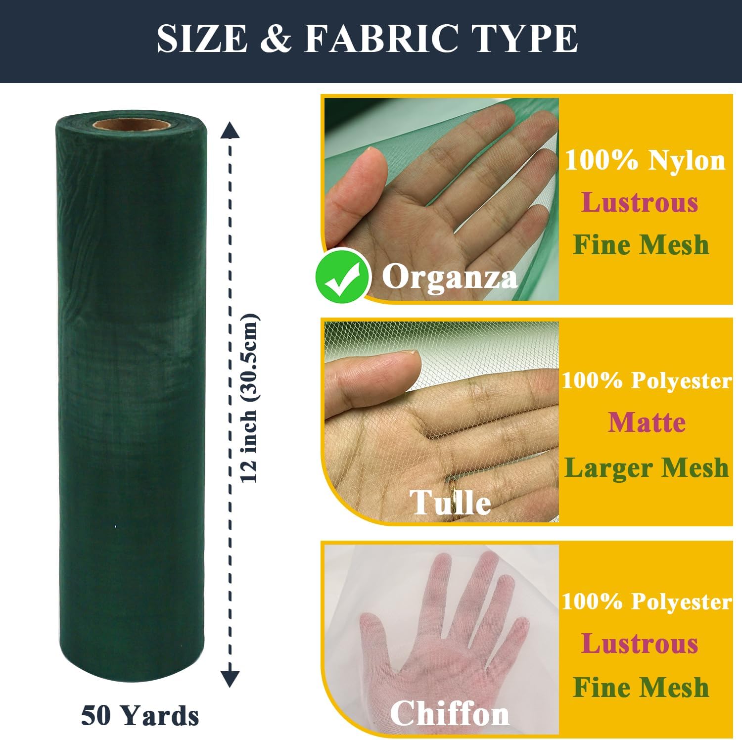 - Lustrous Tulle Fabric: 12 Inches wide, 50 yards long. Plain weave method makes organza fabrics have finer meshes than chiffon and tulle, making them highly breathable. More yarn reflects light better, so there's more sparkle to it.