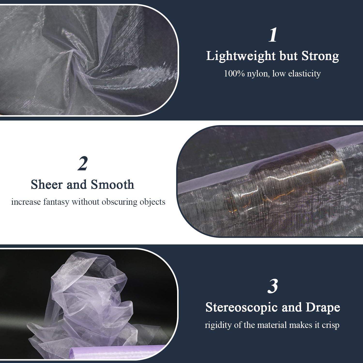 - Versatile Fabric for DIY: It is a very decorative fabric, perfect for creating light skirts, table runner, sheer curtains, veils, capes, sashes. Great for evening wear and home decor, used for prom dresses and holiday party decorations.