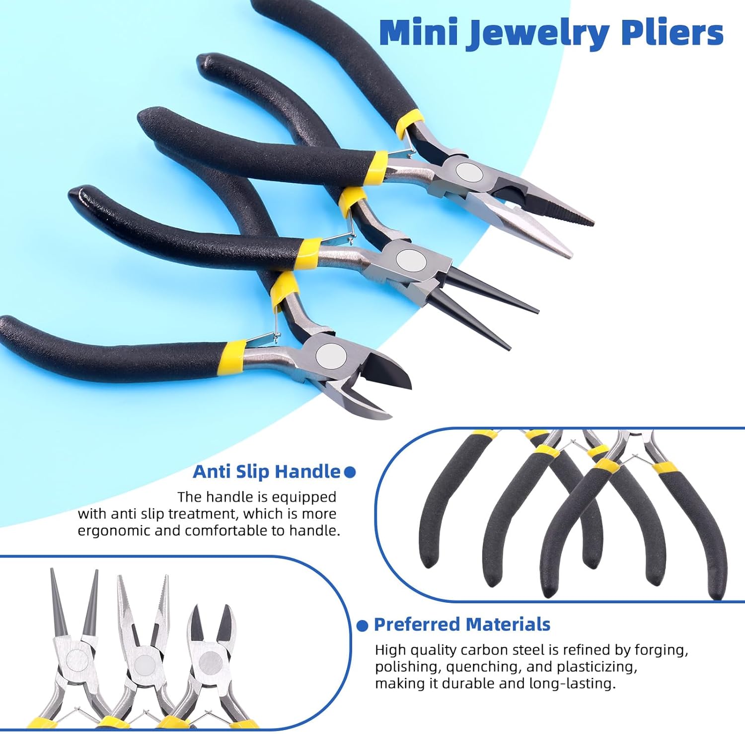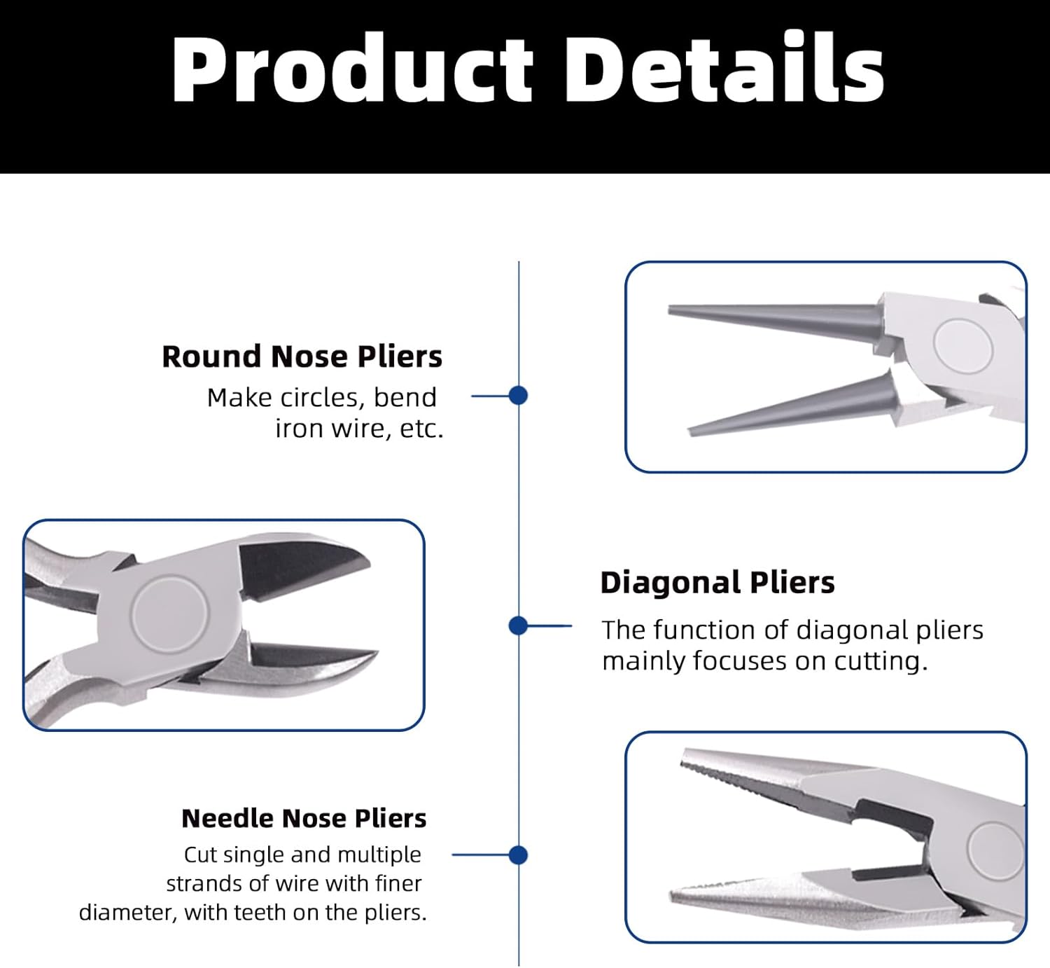 - ♛[Multi-function Pliers]: Needle nose pliers can be used for bending, gripping, crimping, opening and closing jump rings. Round nose pliers can be used for forming loops in wire and wire wrapping. Side cutter pliers can be used to cut the string wire.