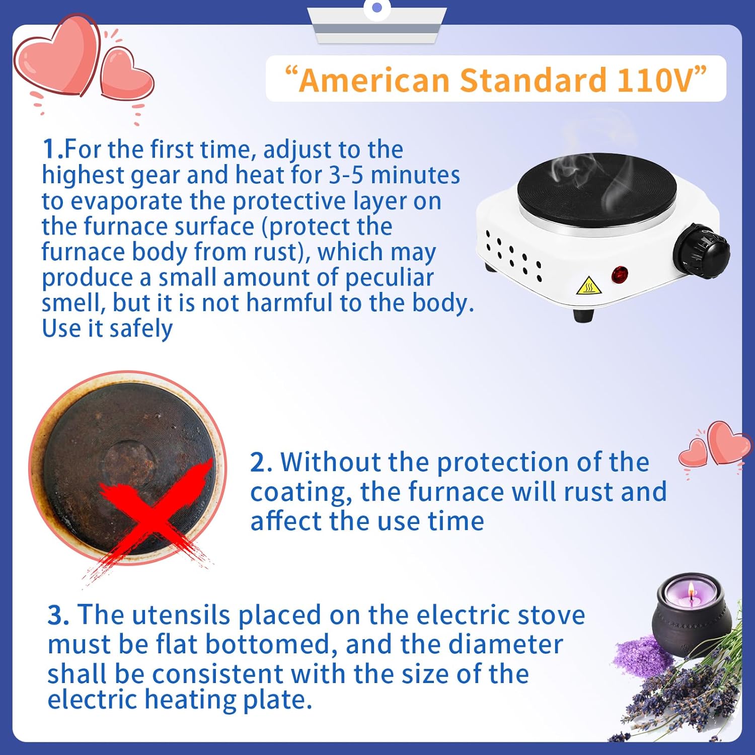 - 【Multiple Usage Scenarios】: The Electric Heating Plate Can Not Only Melt The Wax To Make Candles But Also Make Coffee, Tea, Lipstick, Etc. with The Electric Stove. It Is Small and Easy To Carry. Perfect For Dorms, Offices, Camping and so on.The electric heating plate only supports the American standard 110V voltage.