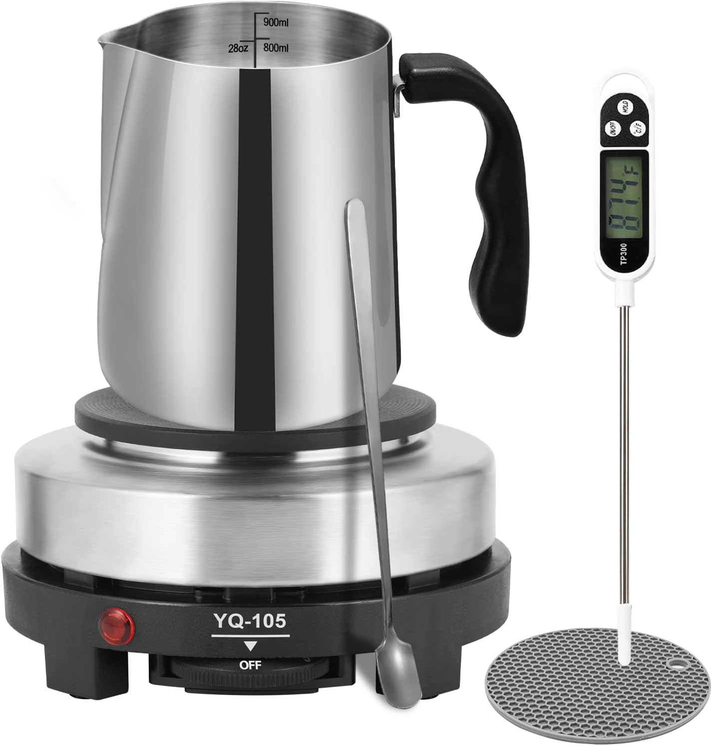 - 【Complete Candle Making Kit】Candle Making Starter Kit Includes 1x900ml Candle Melting Pot, 1x 500w Hot Plate(black), 1x Stirring Spoon, 1x Thermometer, 1x Anti-Scald Pads, 1xuser manual and a Beautiful Gift Box.