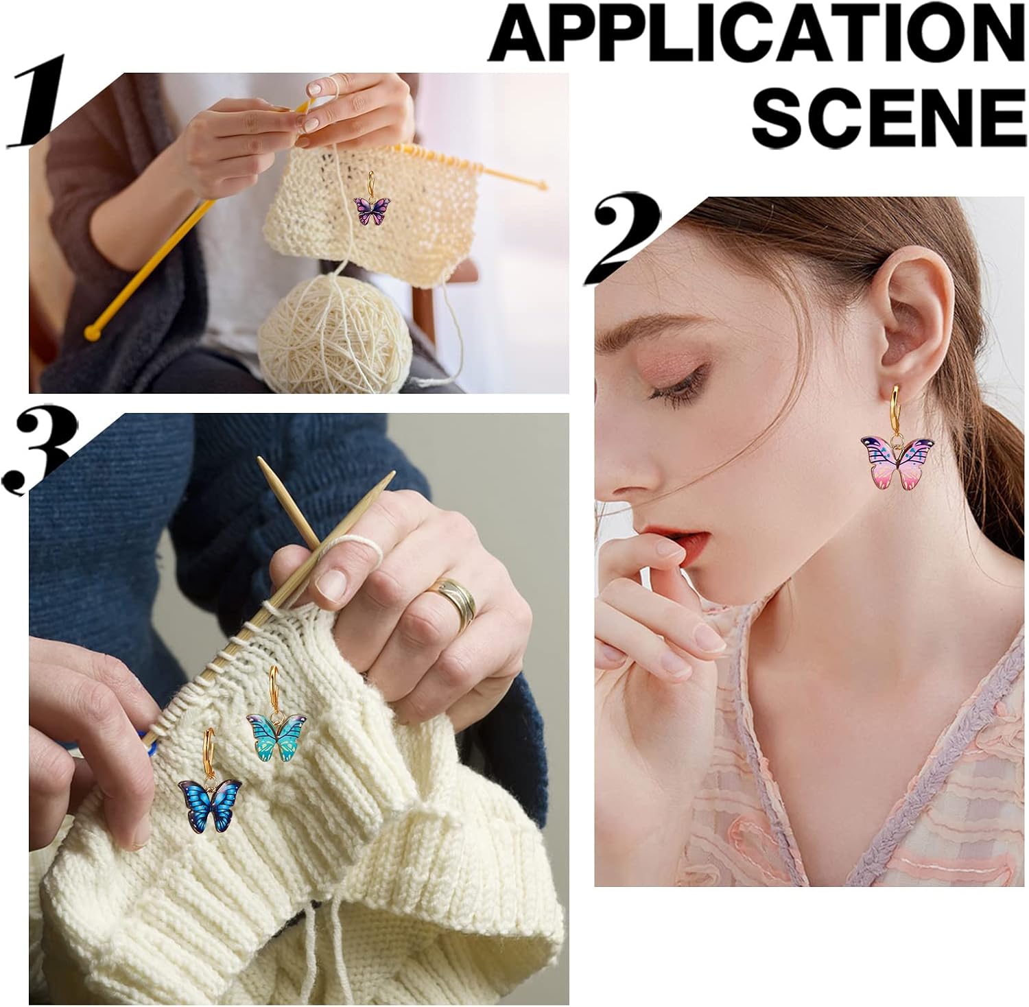 - FUNCTION: Large hole leverback hooks butterfly charm knitting stitch markers are helpful for sewing, weaving and knitting etc. The markers are must have tools to reposite where the knitting pattern starts and ends, to know where you need to repeat or change weaving. Just need to clip the charms on knitting wool to mark it. Removeable and able to be reused