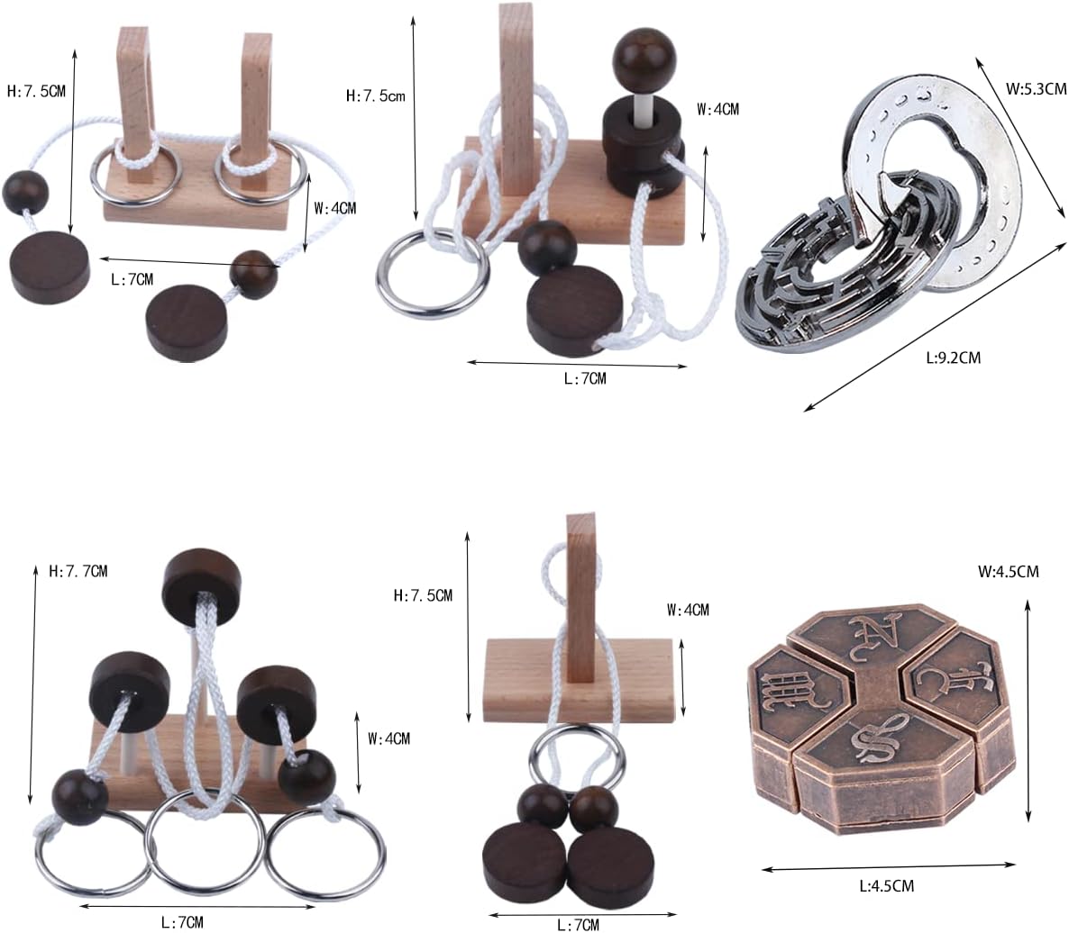 Wooden and Metal 3D Unlock Interlock Assorted Brain Teasers Puzzles,IQ Logic Training Family Game Party Favor Coffee Table Time Unlock Interlock Mind Puzzles Box(6Pcs)