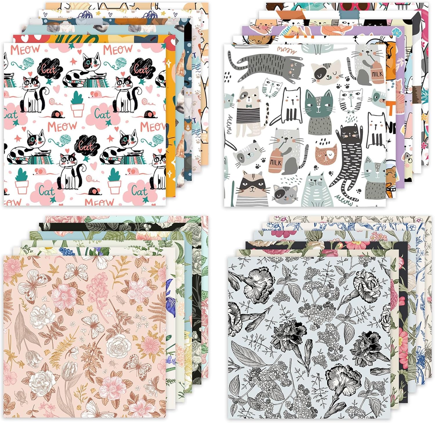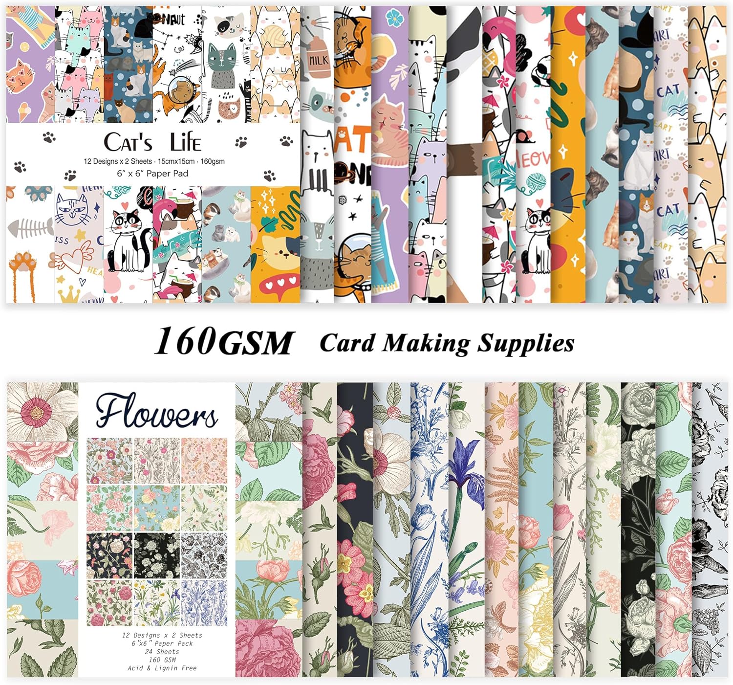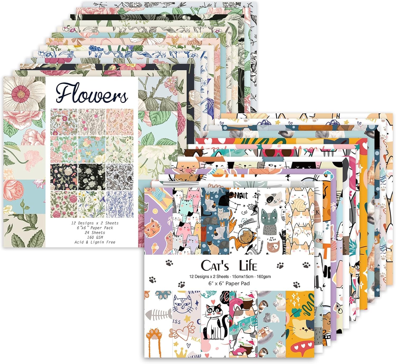 48 Sheets 24 Designs Scrapbook Paper Pad, 6"×6" Single-Sided Decopodge Craft Cardstock Paper,Scrapbooking DIY Decorative Background Cardmaking Supplies.Cat's Life&Flowers