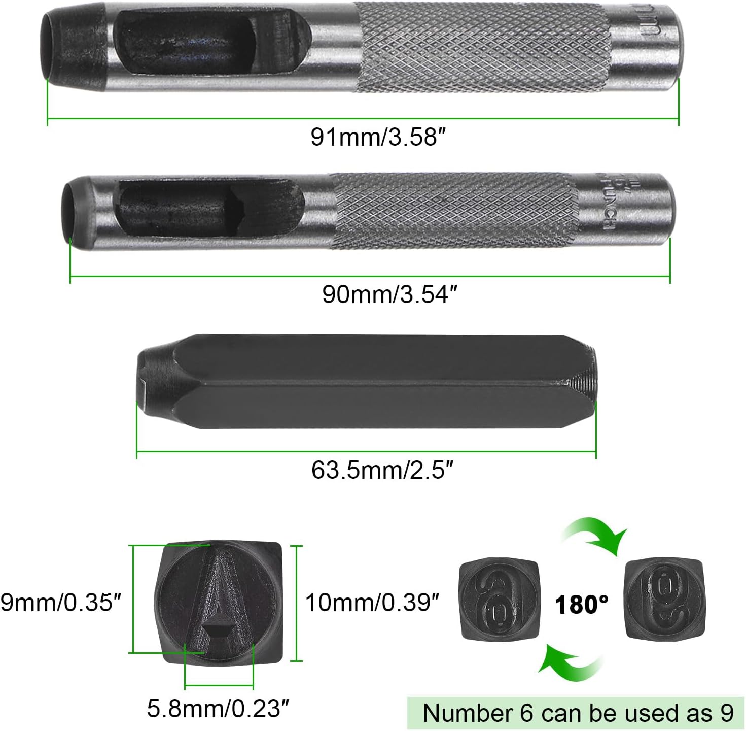 - Metal Stamping Kit - Contains 36pcs of metal punch stamps (26 capital letters from A to Z, numbers from 0 to 8 , an "&" Symbol) sized 5/16" (8mm) of each, and 2 sizes of hole punches.