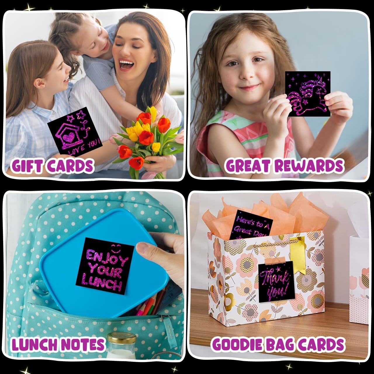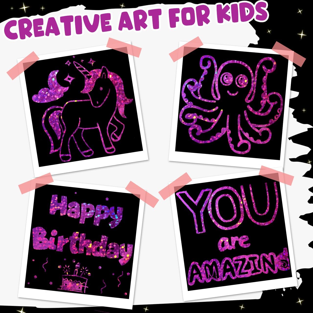 - Create Sparkling & Amazing Artwork: The scratch paper art notes is covered with glitter holographic rose red layer. Just scratch away the black matte surface and the holographic materials will flash dazzling colors and luster at different angles under the sun or light. This black scratch off paper let kids take the time to play, think, and create their inconceivable masterpieces