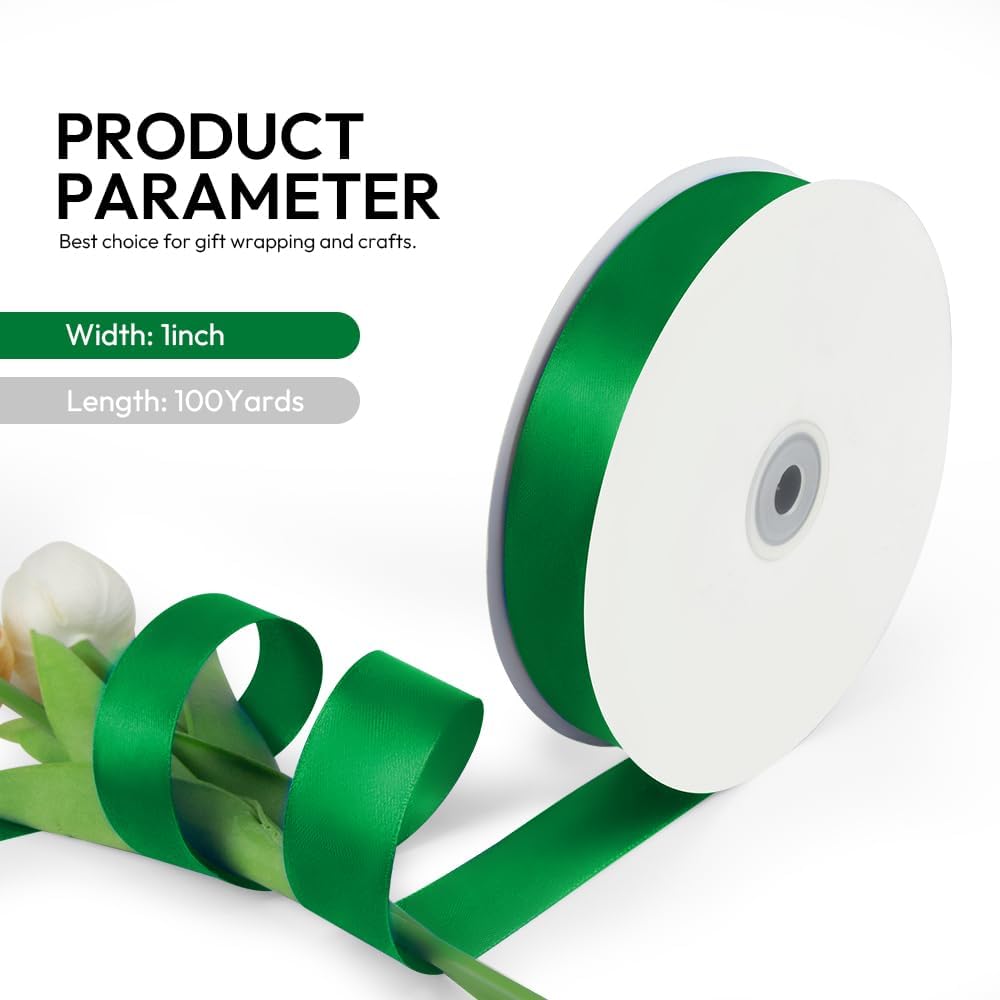 1 Inch 100 Yards Satin Ribbon Green, Solid Color Fabric Ribbon for Gift Wrapping, Wedding, Polyester Gift Ribbon for Birthday Party Decoration, Craft, Hair, Floral, Sewing