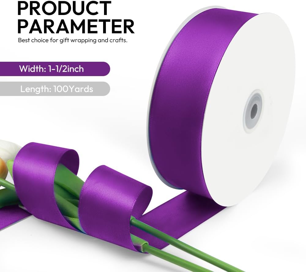 1-1/2 Inch 100 Yards Satin Ribbon Purple, Solid Color Fabric Ribbon for Gift Wrapping, Wedding, Polyester Gift Ribbon for Birthday Party Decoration, Craft, Hair, Floral, Sewing