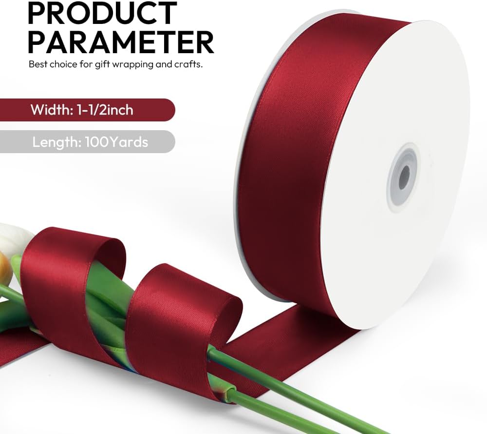 - 【High Quality】: Our fabric satin ribbon is made of 100% high-quality polyester. The single face ribbon for gift wrapping is Wine Red(Burgundy) color and has smooth texture which is easy to cut and use.