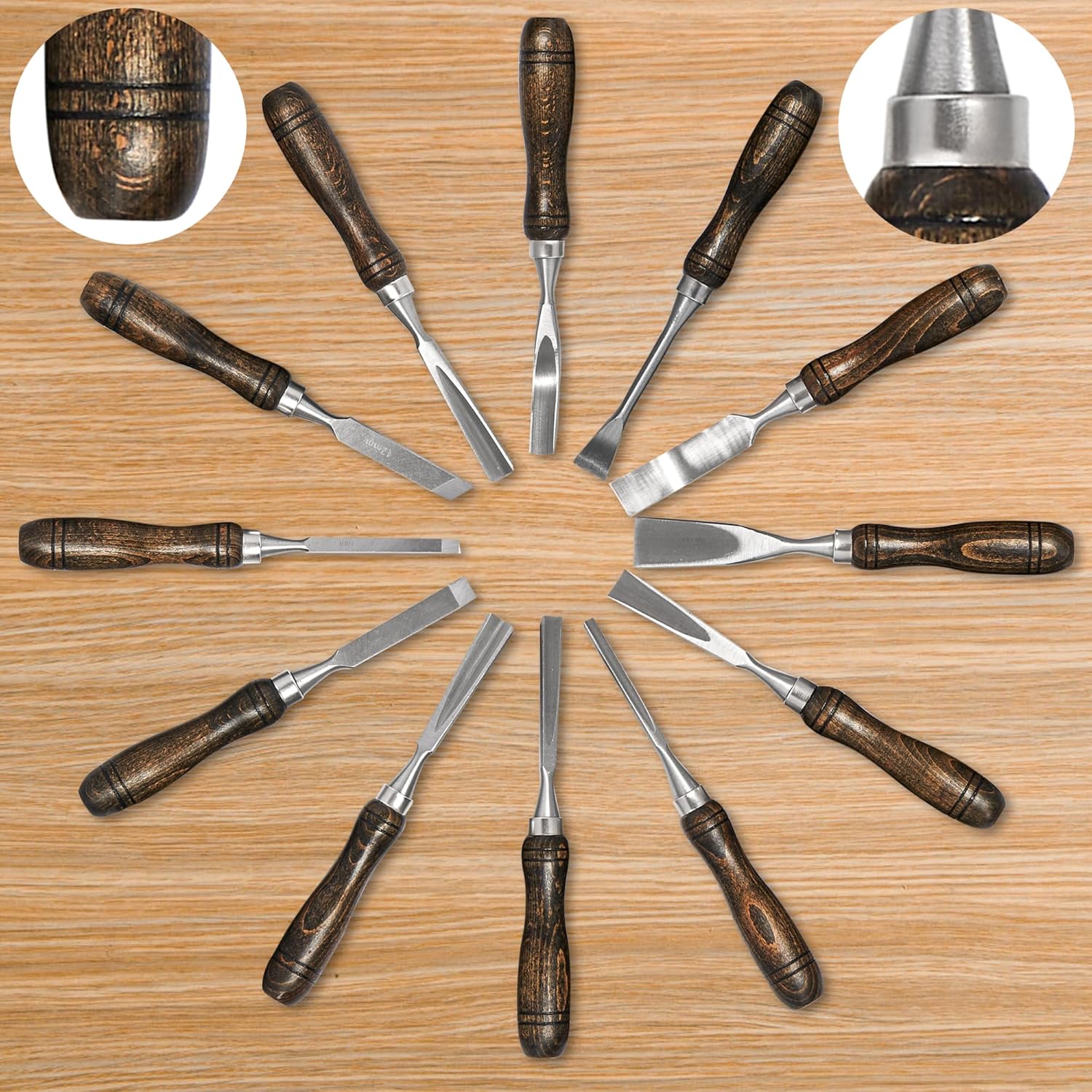 SELFIE CAT 12 Piece Wood Chisel Set for Woodworking Tools Wood Carving Tools with Wooden Case Wood Carving Kit for Beginners and Professionals Black Walnut