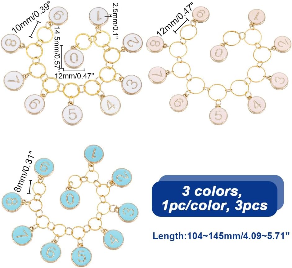 - Package Content -- Contains 3pcs number charms knitted row counters, anout 4.1-5.7 inch(10.4-14.5cm) long, 8.2mm link rings can fit US: 0 to 10-1/2 knitting needles, IMPERIAL: 3 to 14 knitting needles, 10mm/12mm link rings can fit US: 0 to 15 knitting needles, IMPERIAL: 0 to 14 knitting needles