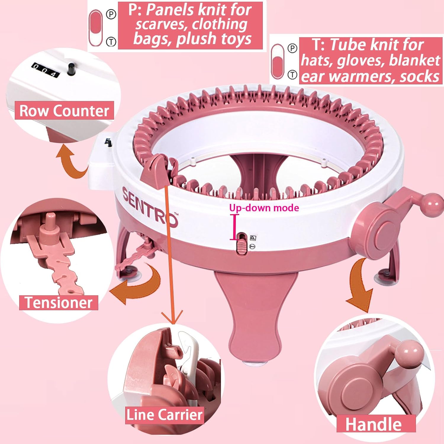 - 【Panels & Tube Knitting Machine】This manual 48 knitting machine has dual modes to meet you multiple needs.It has a tube/panel weave conversion key, which can be easily converted with one key. T:You can knit round items such as hats,socks,gloves, plush toys,etc. P: It can knit sheet items, such as scarves, bags, sweaters,etc.Our knitting machine has 4 adjustable yarn densities,which makes the stitches of the fabric more coordinated and smoothly and is not easily stuck or dropped stitches.