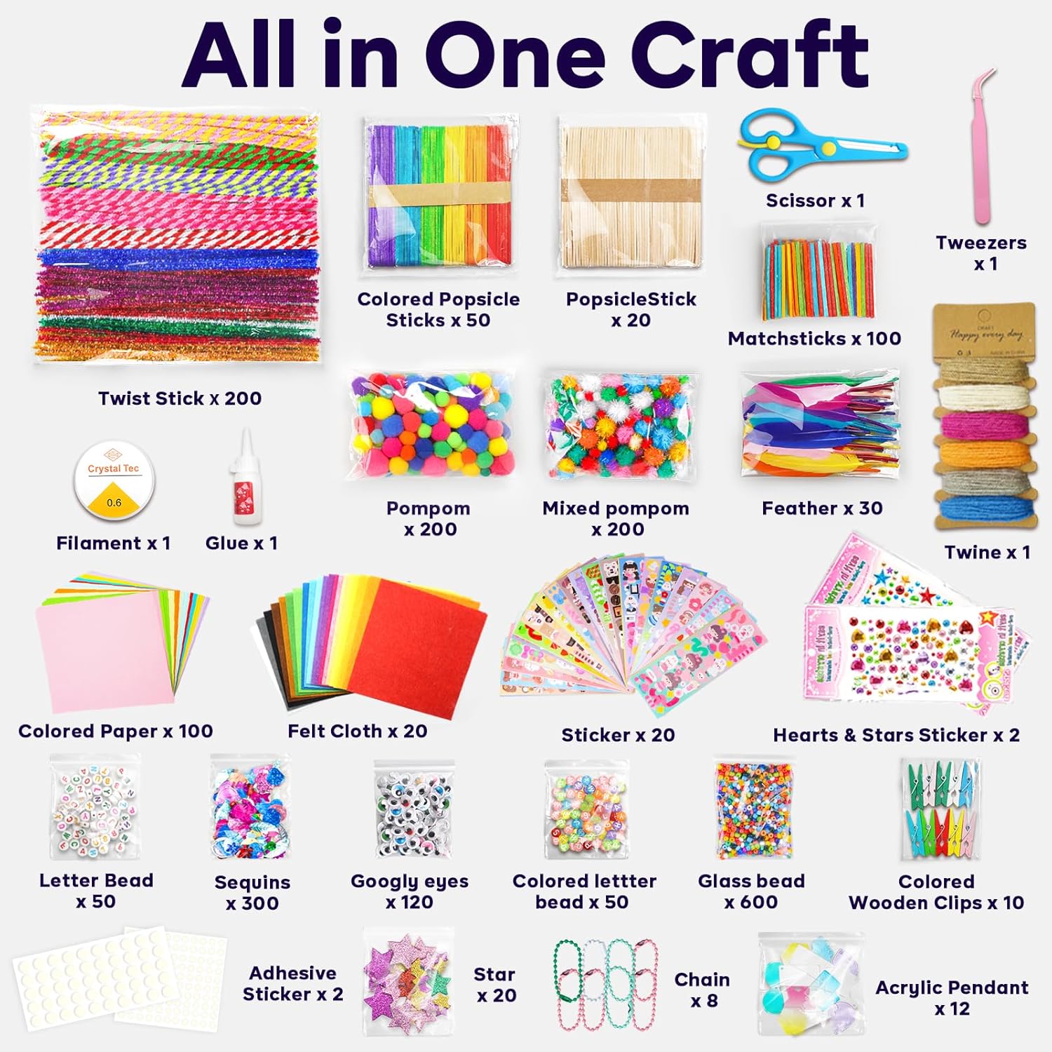 - All-In-One Craft Kit: Our amazing Arts and Crafts Kit is overflowing with creative potential! Packed with a wide variety of craft supplies including colorful pipe cleaners, versatile construction paper, fluffy pompoms, expressive googly eyes, and handy crafting tools, it provides everything you need to turn your imagination into art!