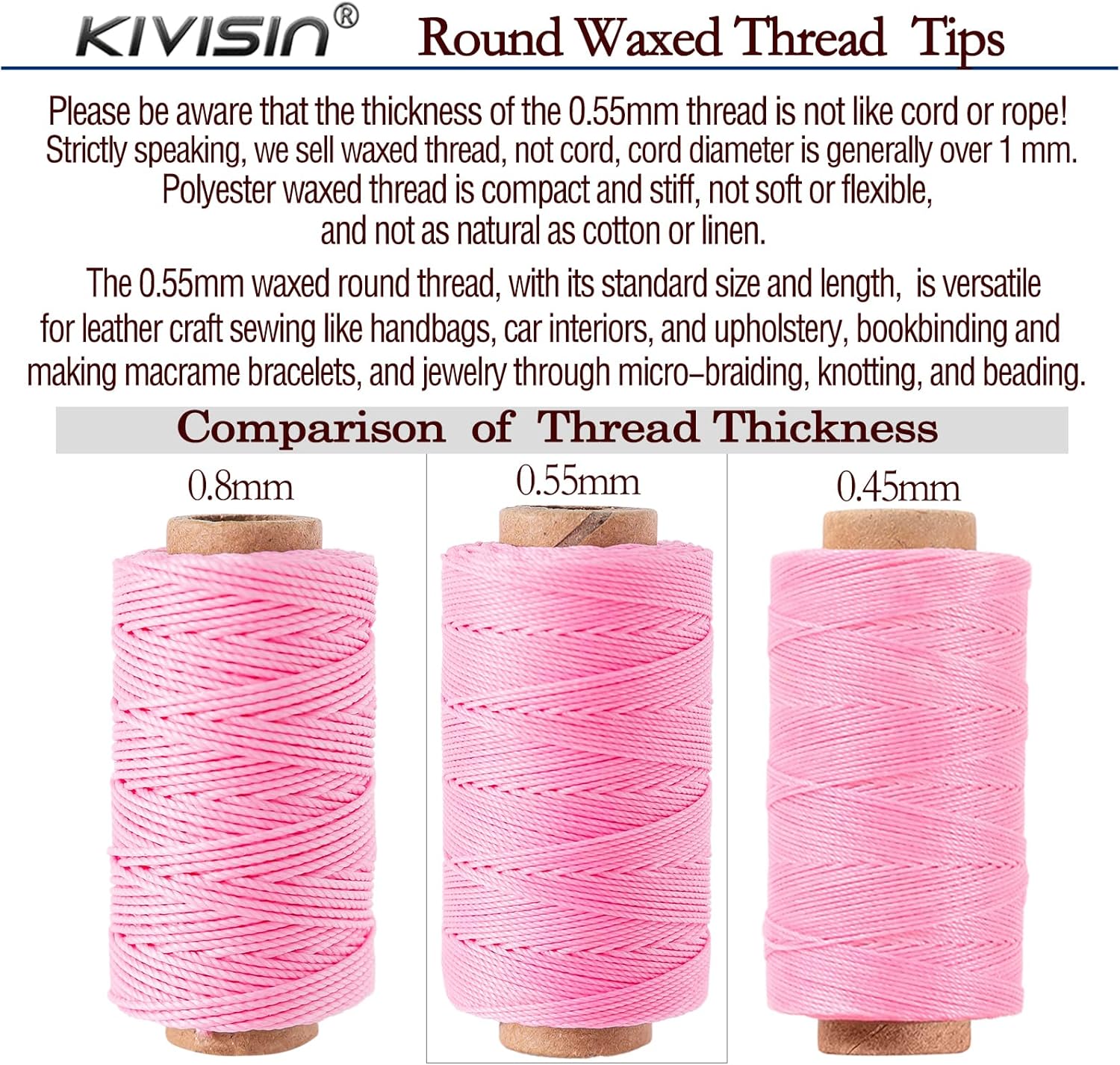 - Performance - This round wax thread is durable, waterproof, stiff, and smooth to the touch. It has a slight tackiness and is non-elastic. It will not shrink, unravel, or fuzz, and will maintain its original shape over time