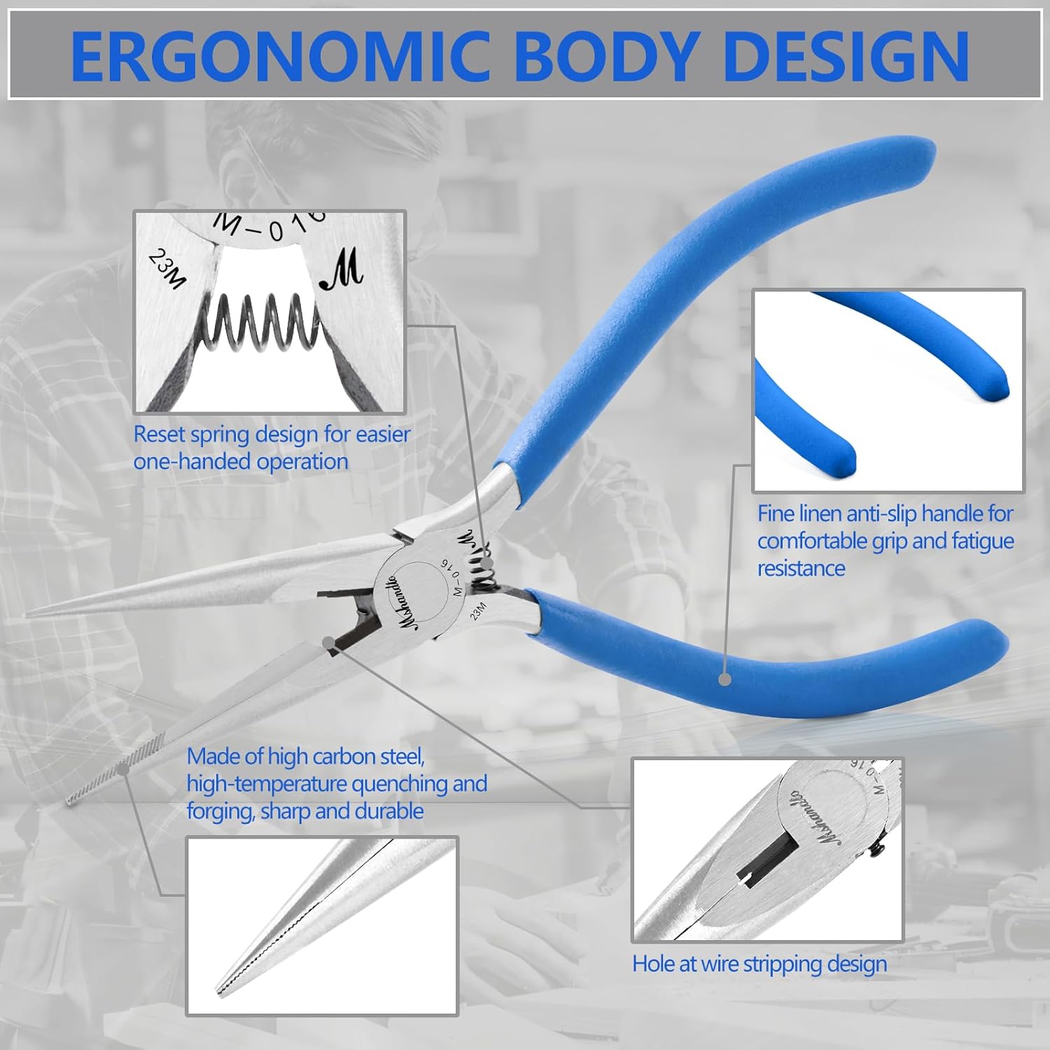 - đź› Premium Materials: This needle-nose plier is crafted from strong high carbon steel, treated at high temperatures for high strength jaws that won't easily warp. They're also coated in an anti-rust material to prevent corrosion and extend their lifespan
