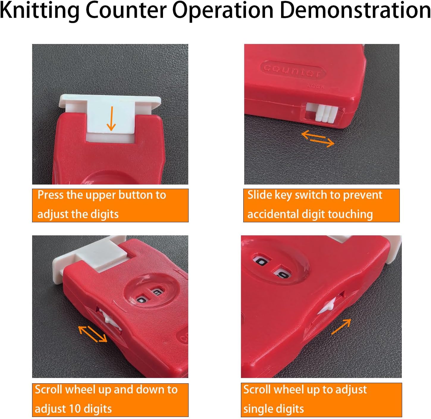 - How to use: When you start knitting, simply press the top white button to adjust the number of digits, and each time you press the top of the counter, the count will increase from 0 to 99.