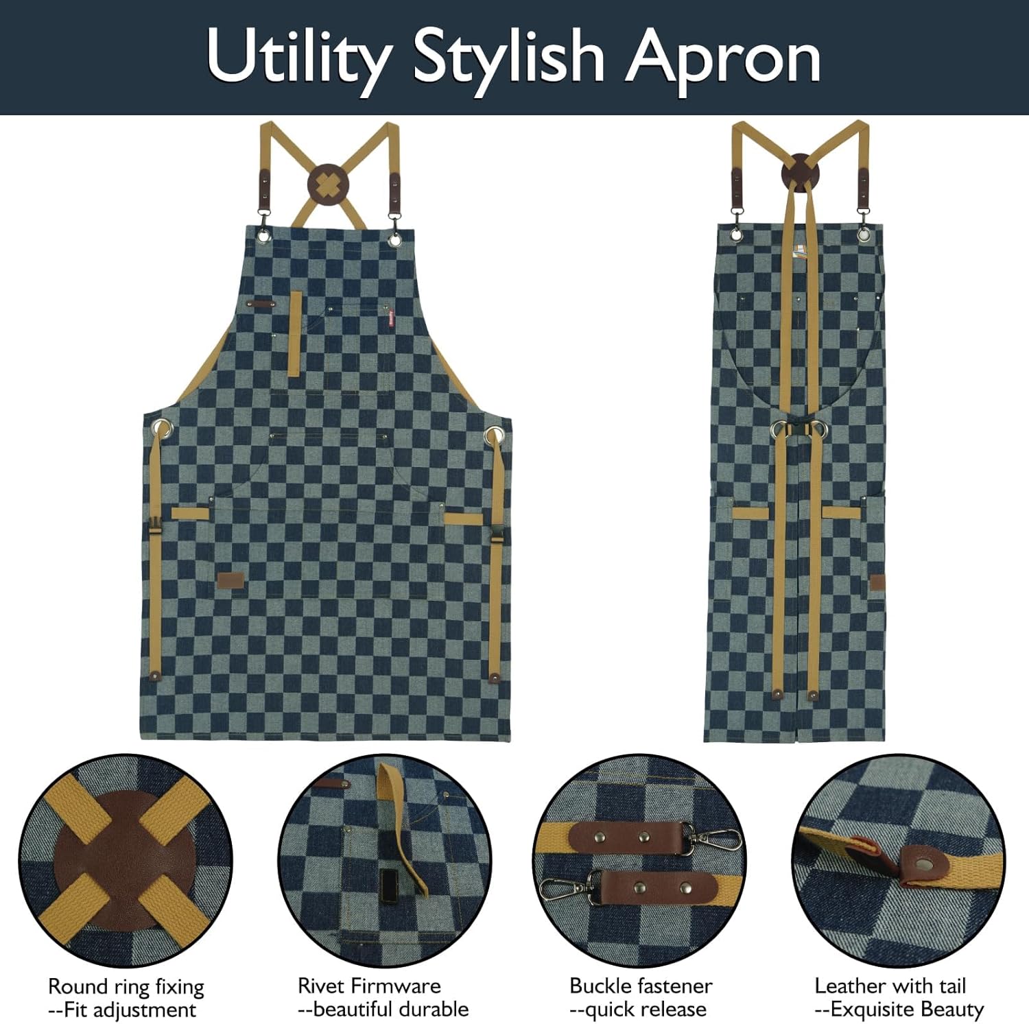 Kitchen Apron, Work Apron, Canvas, Multiple Pockets, Gardening, Painting, BBQ, Artist, Carpenter, Sizes M to XXL, Checkered Denim