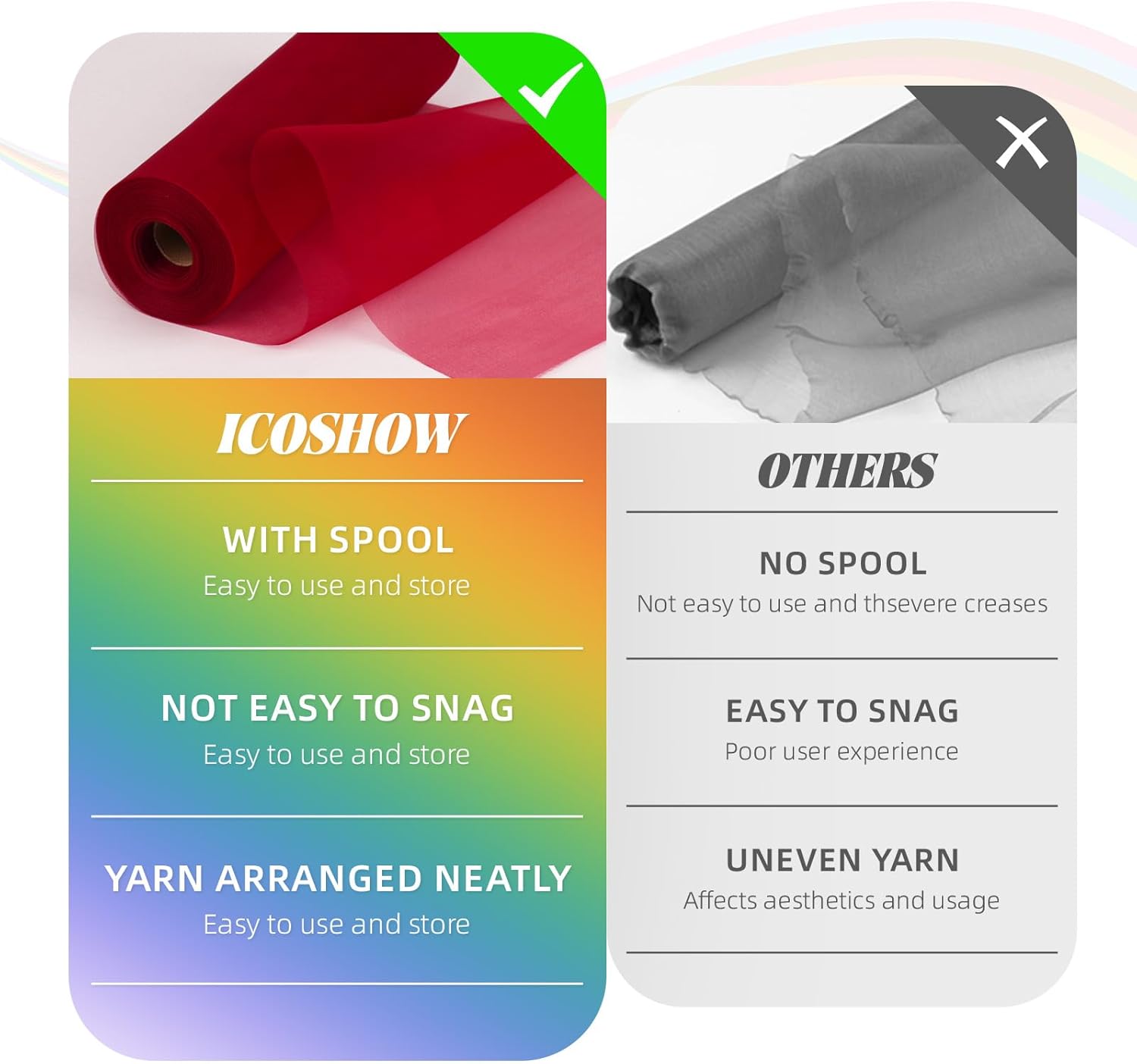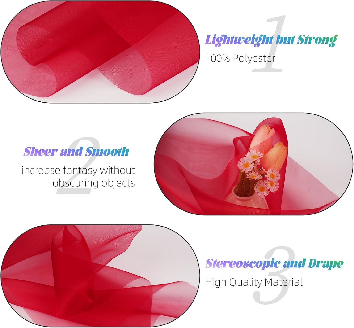 - 【Convenient to Store & Use】Cut it freely according to the length you want, and the edges will not unravel. The organza fabric wraps neatly around a paper core for easy folding and storage. It can maintain its vivid original color after repeated use, and it is not easy to fade.