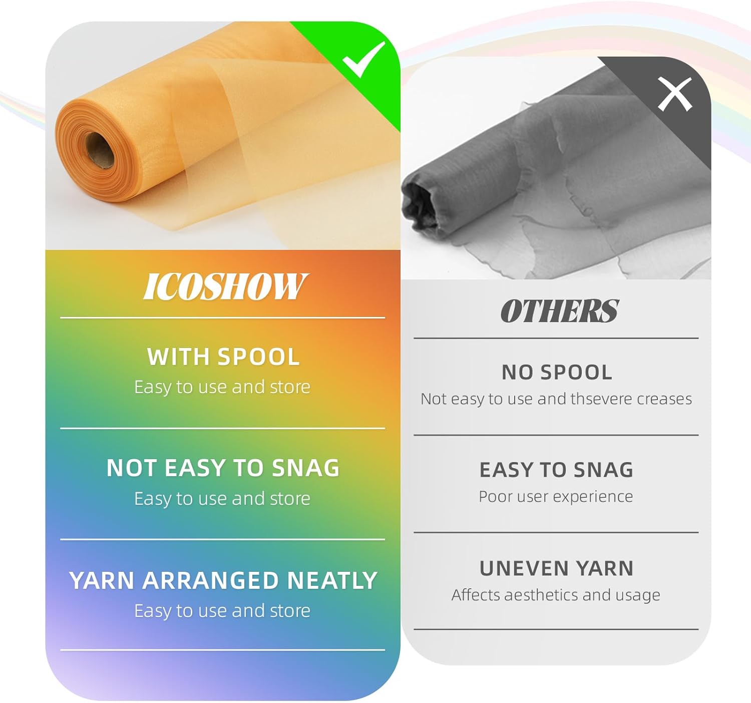 - 【Convenient to Store & Use】Cut it freely according to the length you want, and the edges will not unravel. The organza fabric wraps neatly around a paper core for easy folding and storage. It can maintain its vivid original color after repeated use, and it is not easy to fade.