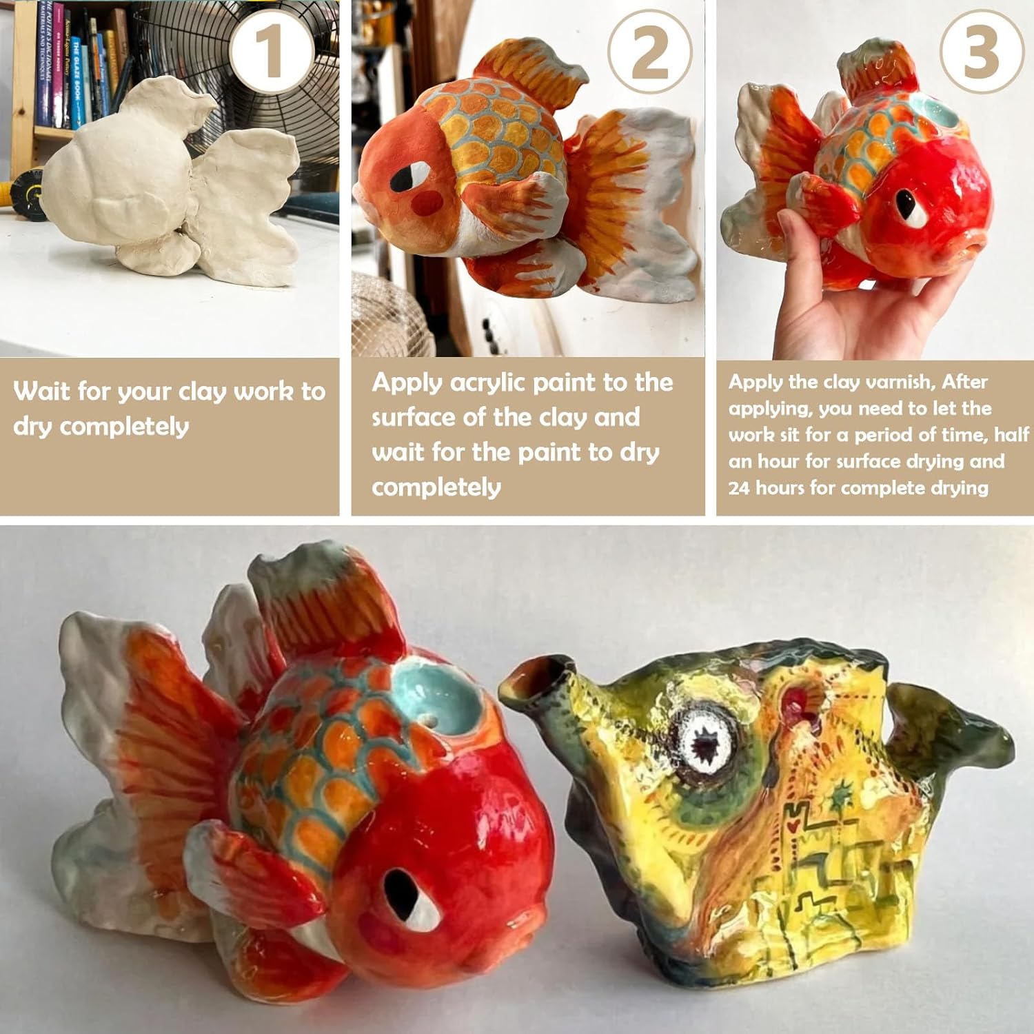 - How to Use: Apply the color you want and wait for it to dry completely. Then apply our clay varnish. It takes 24 hours for gloss varnish for air dry clay to dry completely. Note: They are not suitable for food or dishwasher use