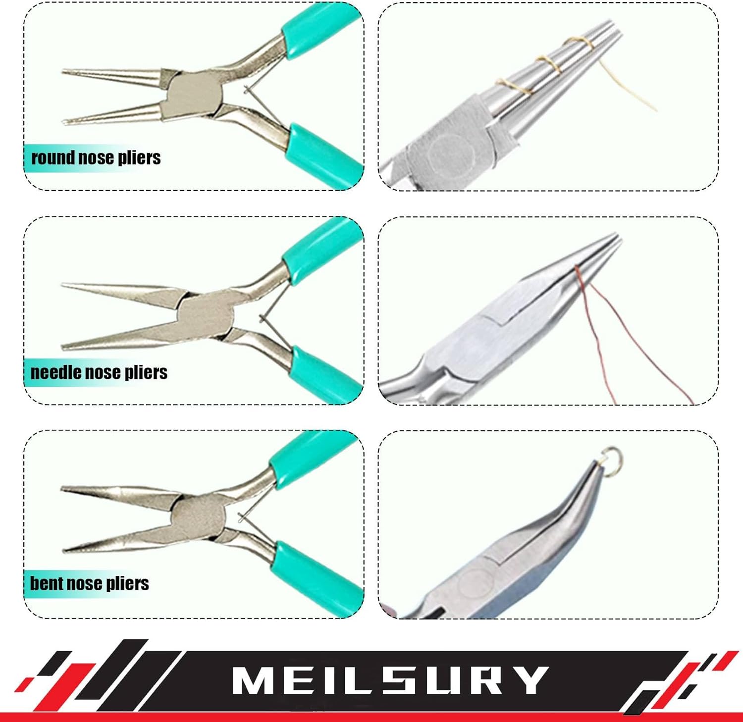 - The set consists of end cutter nippers, needle nose pliers, round nose pliers, wire cutters pliers, bent nose pliers, flat nose pliers, 6-step bail making pliers, nylon jaw pliers, crimping pliers, split ring pliers, needle point jewelry tweezers with shovel and a storage pouch with a zipper.