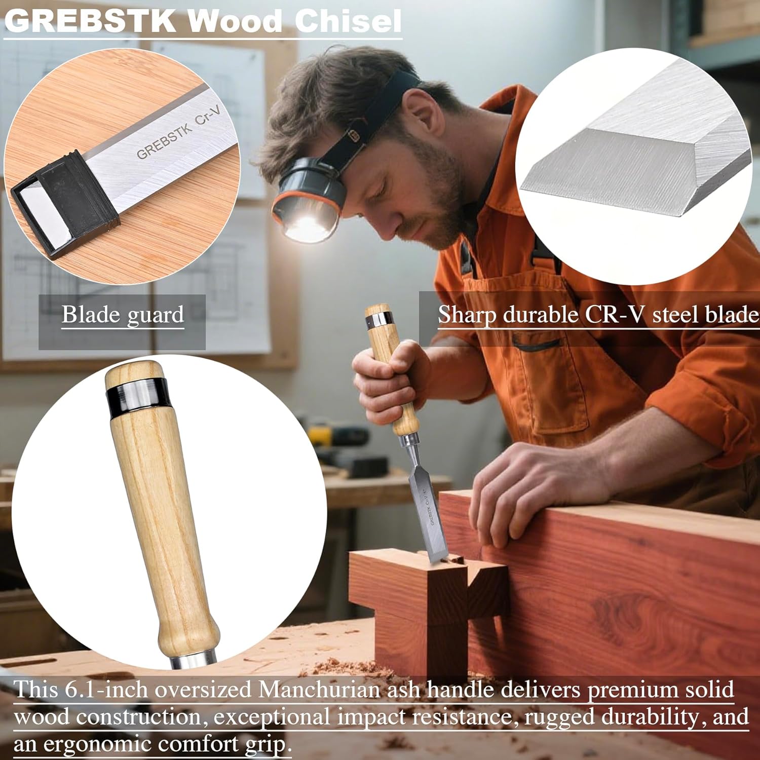 GREBSTK 4 Pcs Wood Chisel Set, CRV Steel Bevel Sharp Edge Bench Chisels with Safety Caps, Comfortable Oversized Solid Wood Handle, for Woodworking and DIY Projects, 11"x(1/4", 1/2", 3/4", 1")