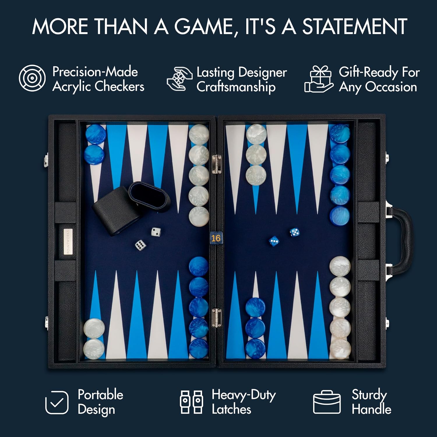 - What's In The Box - Premium Backgammon game set for Ultimate Gameplay: Featuring a handcrafted 19 x 12.5-inch backgammon board, 30 unique 1.6-inch individually polished acrylic checkers, four rounded acrylic dice, a stunning 1-inch gold-accented doubling cube, two felt-lined dice cups, and a comprehensive rules guide by Pointworks. Every element is designed to elevate your game from the moment you open the box.