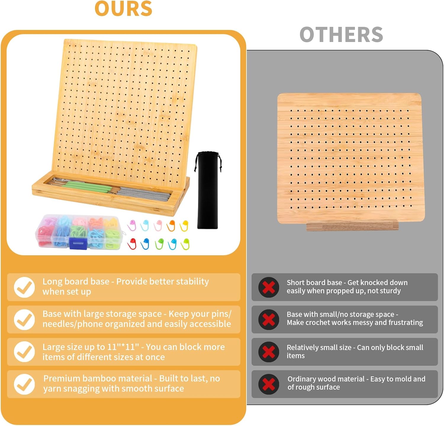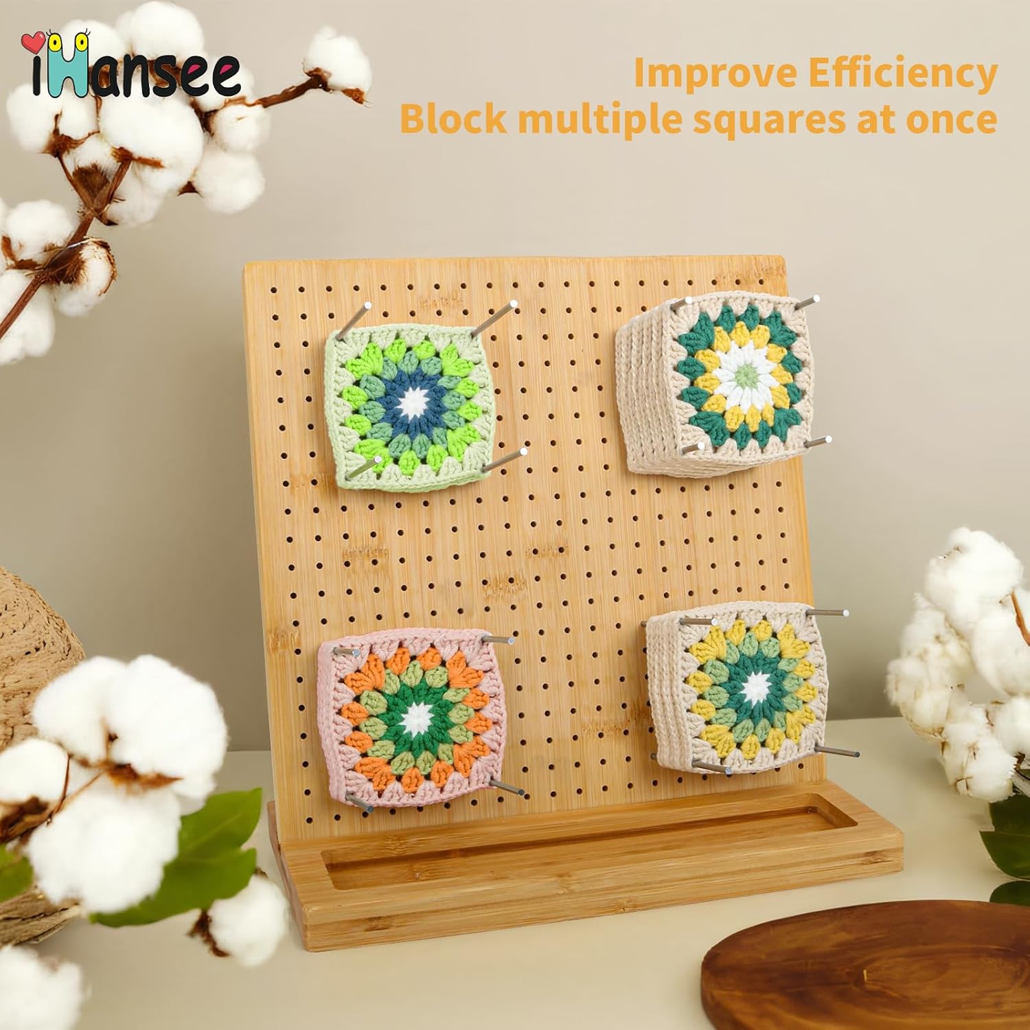- ăDurable and Sustainableă The iHansee crochet blocking board is crafted from premium bamboo with a sturdy pine wood base, providing long-lasting stability and reusability, unlike foam boards that wear out over time. 11" square size is large enough to accommodate various shapes and sizes. A big help in stacking up granny squares as you make and keeping everything the same size and flat!