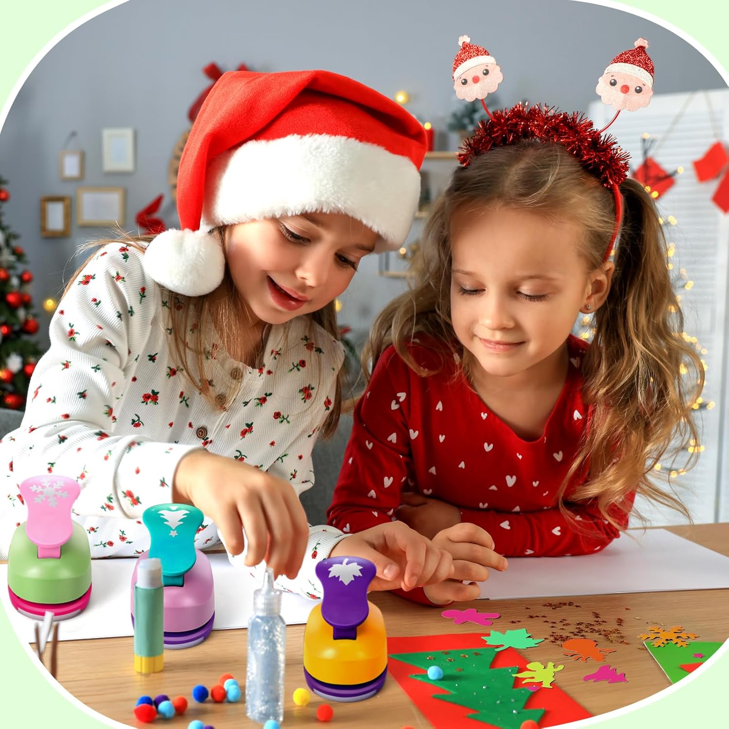 CHENGU 16 Pcs Craft Holes Punch Paper Punchers Scrapbook Punches with Craft Sticker Paper, Round, Star, Square, Heart, Flower, Wave Circle Shape (1 Inch,Christmas)