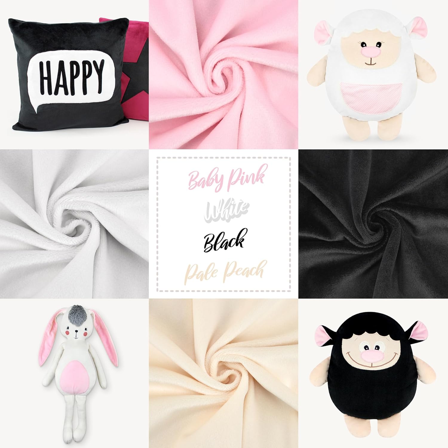 - High-quality plush material: Bundle of 4 pre-cut, slightly stretchy minky fabric pieces made from 100% polyester microfiber, with a size of 19.5x29.5 inch (50x75 cm) each, in the colors WHITE, BLACK, BABY PINK & PALE PEACH. Our fuzzy, durable & easy-to-sew plush fabric retains its comfort, softness and vibrant color even after multiple washes, ensuring long-lasting quality.