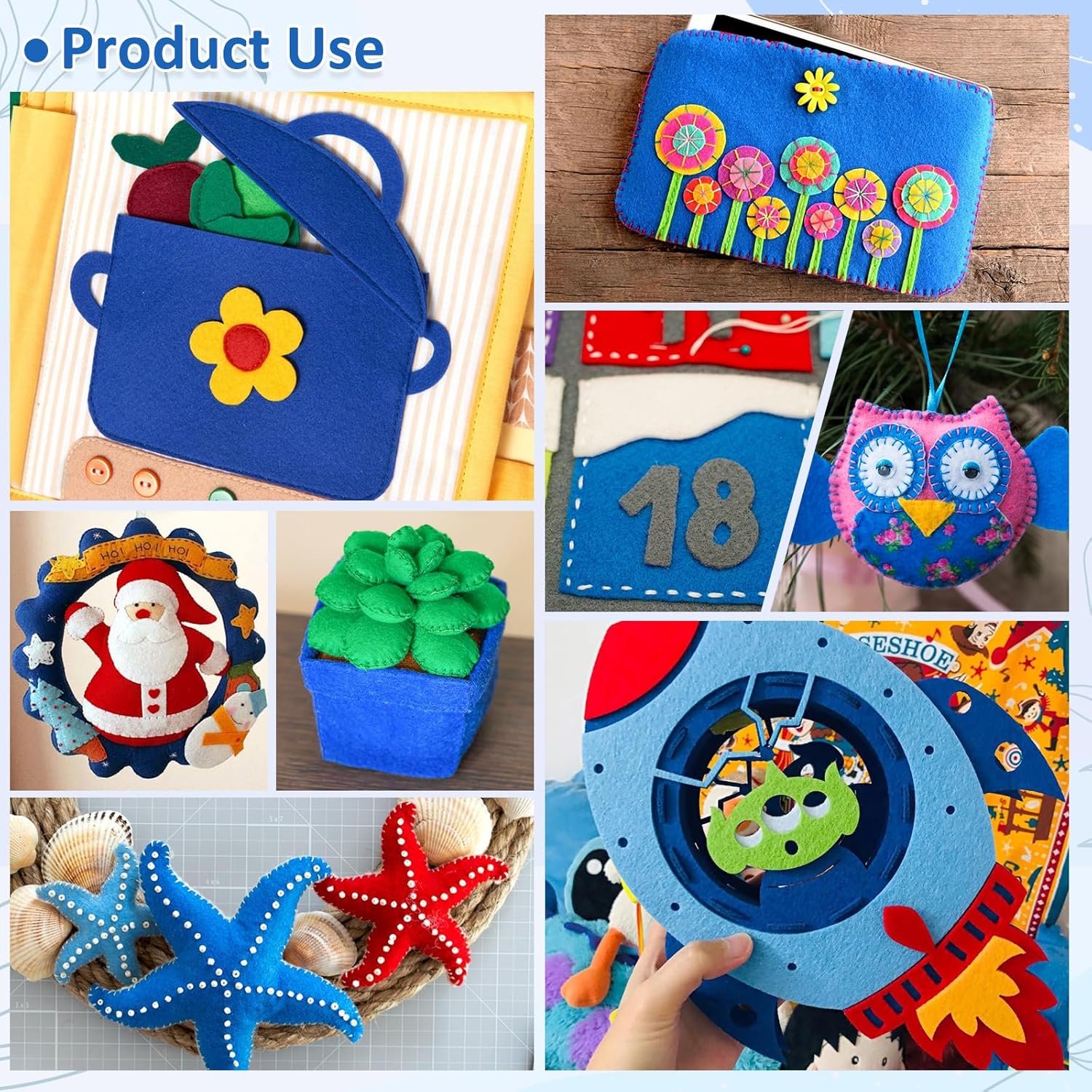 - 【Blue Felt Fabric Set】:Our felt fabric portfolio contains 13 Blue Series colors,the size of each roll is 8 "x35"(20.5x90cm) and the thickness of the felt is about 1.4mm. These craft felt are Thick and light tight, it can withstand prolonged use without wear or tear.