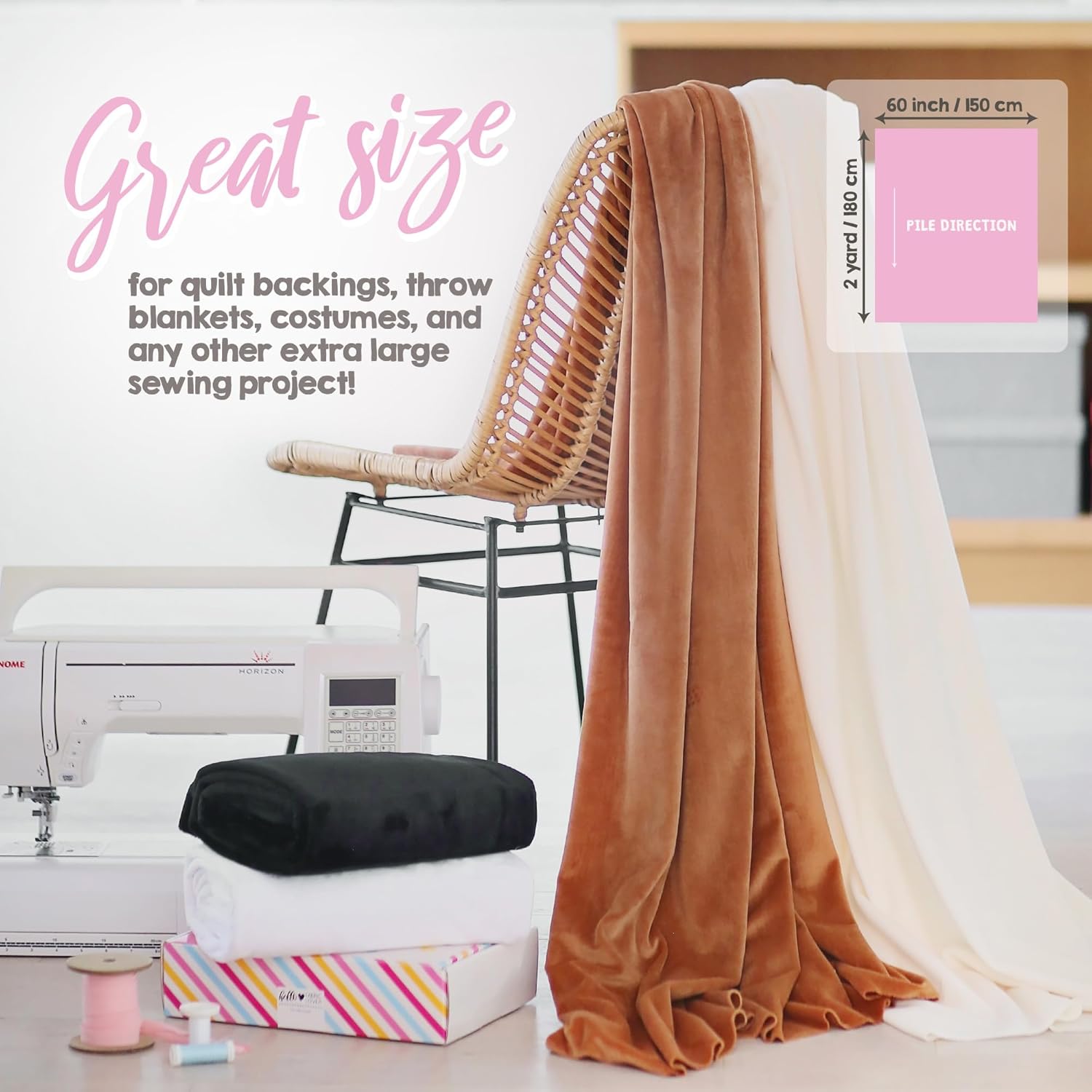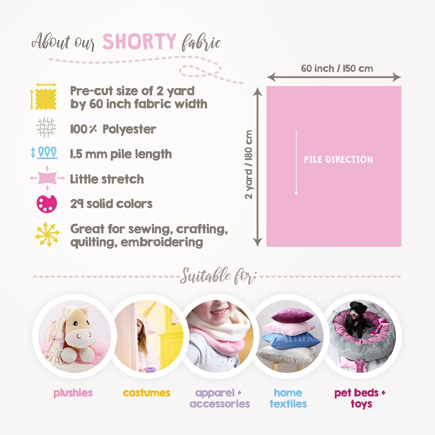 - High-quality plush material: Pre-cut, slightly stretchy minky fabric made from 100% polyester microfiber with a size of 2 yard by 60 inch fabric width (180×150 cm). Our durable & easy-to-sew plush fabric retains its comfort, softness and vibrant color even after multiple washes, ensuring long-lasting quality.