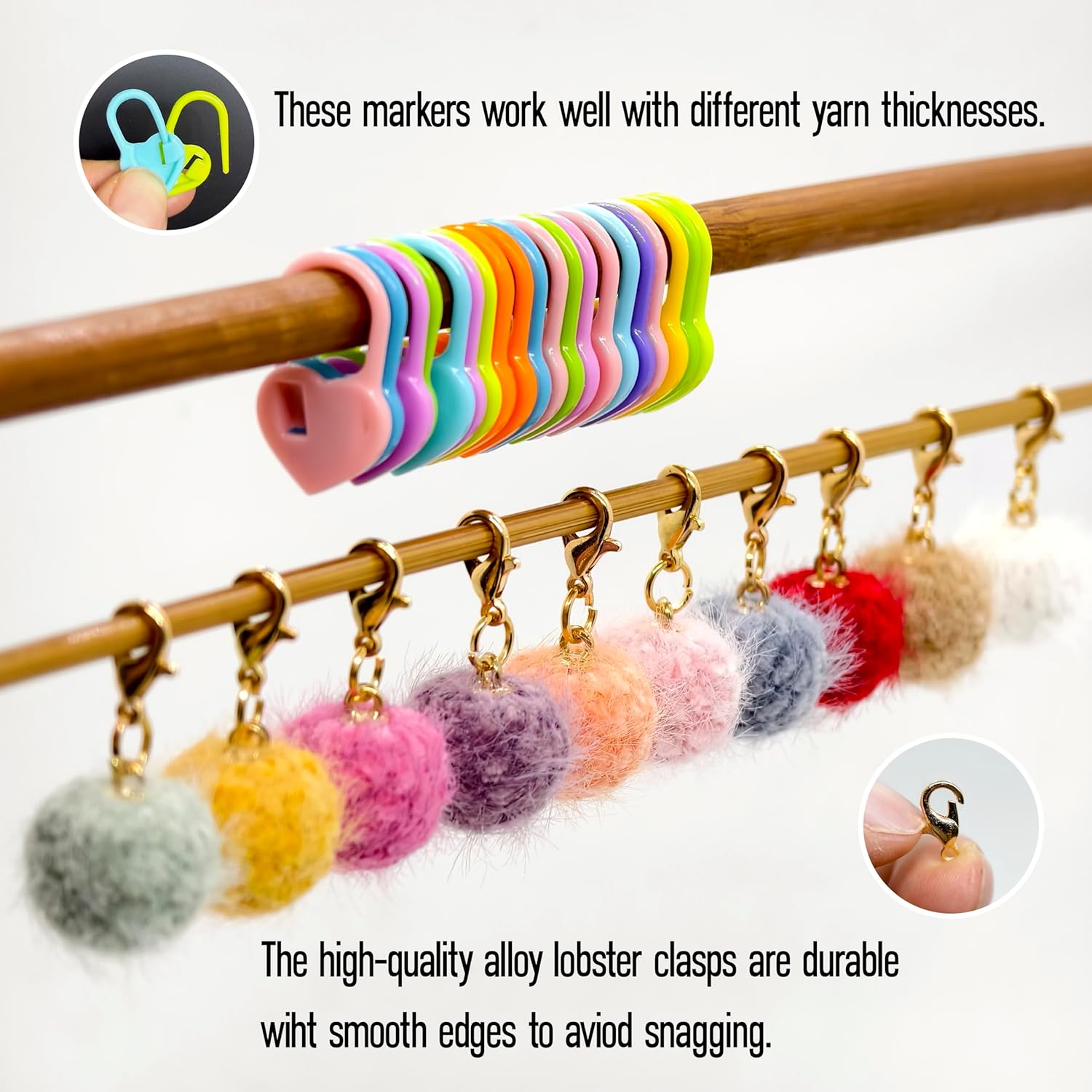 - Premium Materials:The colorful wool balls crochet markers are soft and add a touch of fun to your knitting process. The high-quality alloy lobster clasps are durable with smooth edges to avoid snagging. The lightweight plastic heart-shaped counting pins are easy to open and close, making them user-friendly.