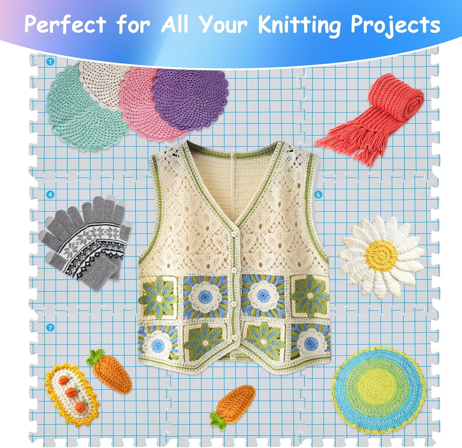 - 🧶[Waterproof & Steam Resistant] - The blocking mats for knitting corchet projects are heat resistant. Steam will not deform it. And the grid lines with high quality printing technology, it won't fade or get ruined. You can clean the blocking mats with wet cloth if needs.