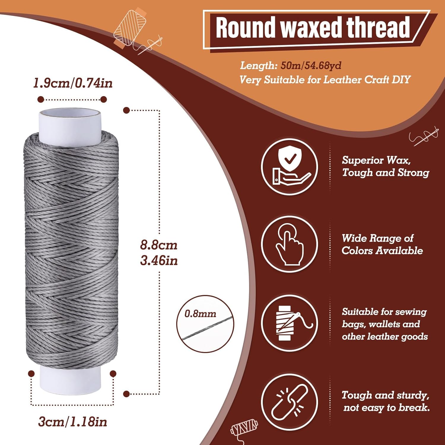 - Waxed Thread for Leather: 0.8 mm thick, 54 yards per spool, leather sewing thread made from braided polyester, the amount of wax on the cord is moderate and easy to handle, Multi-strand woven round waxed thread strong, wear-resistant, and waterproof, ideal for leather sewing, stitching, braiding, knotting, beading, binding, necklace and bracelet making