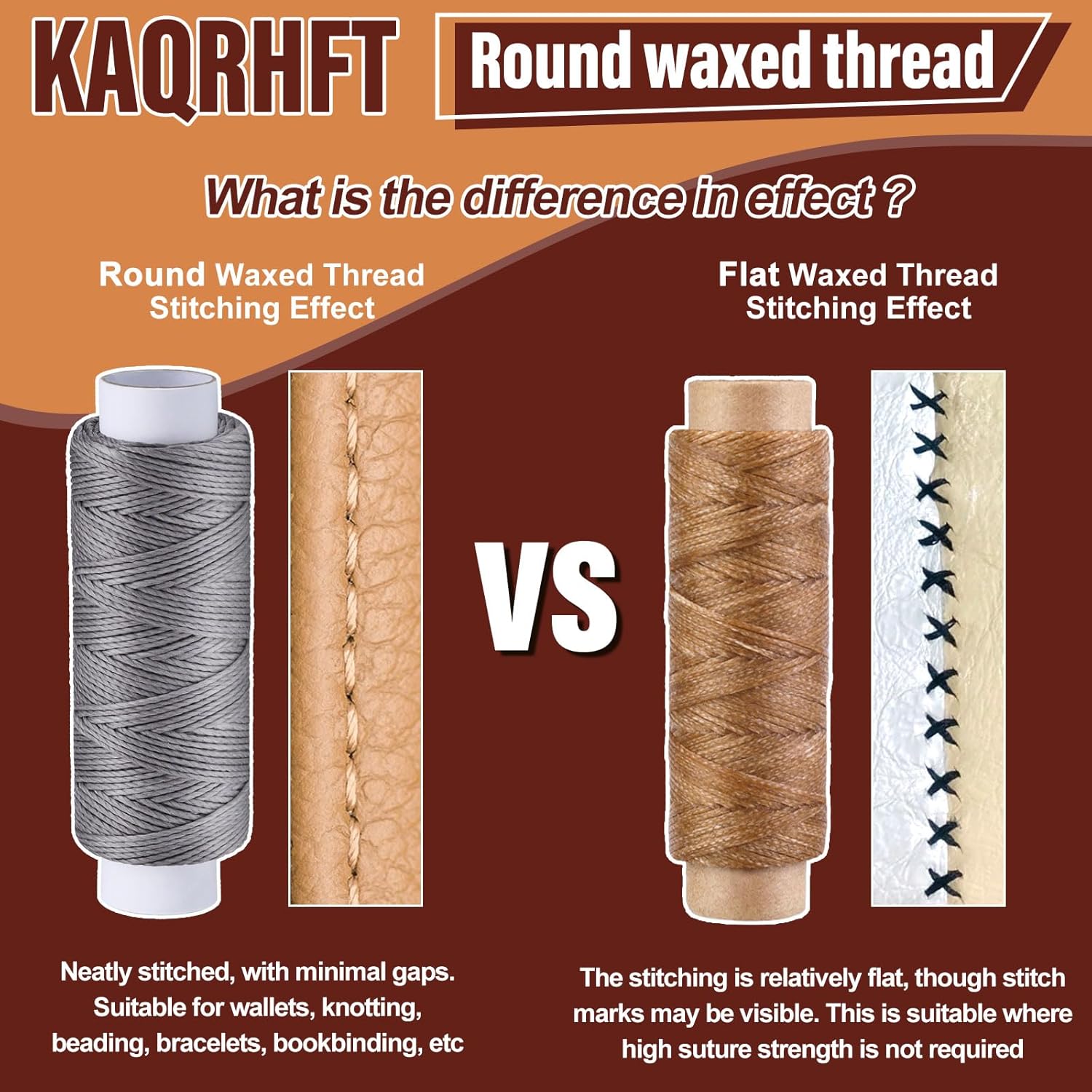 - Easy to Use: Round wax thread differs from flat wax thread, compared to flat wax thread, which sometimes catches or twists, round wax thread offers a more aesthetically pleasing sewing result, it is suitable for various leather craft products, such as wallets, handbags, It can also be used in micro-braiding, knotting, and beading to create tassel bracelets and jewellery, etc