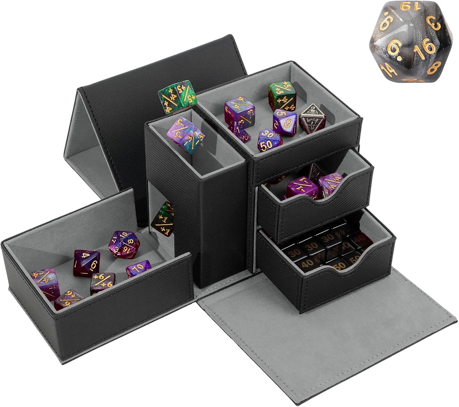 - High-capacity Storage: The Stepane Dice Box's tiered design increases storage capacity while ensuring a more compact overall; with two organizer drawers and an open platform large enough to hold two sets of standard gaming multi-sided dice, you are free to place your gaming accessories in an thoughtful and comprehensive design