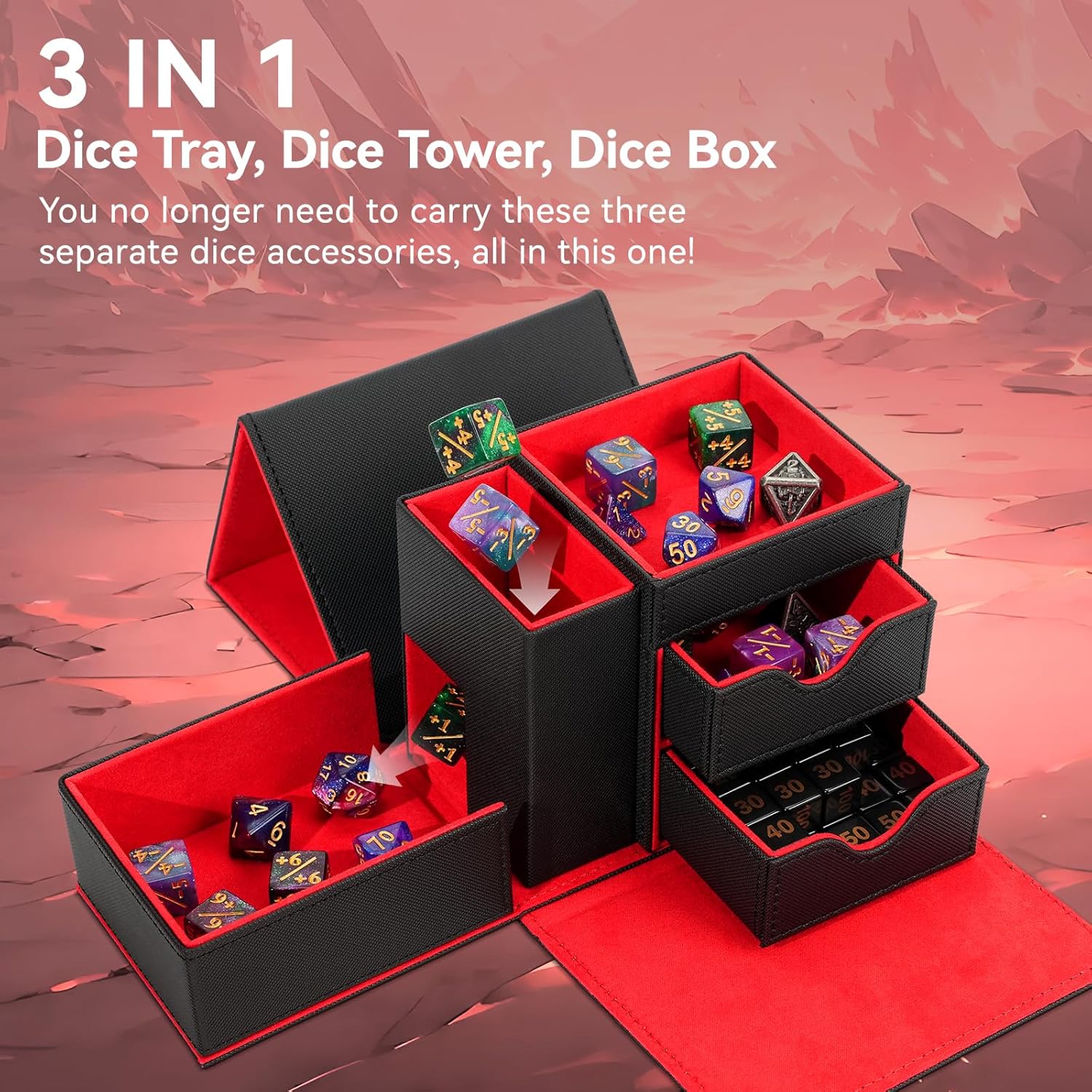 Dice Tray & Dice Tower Storage Box, 3 in 1 Dice Holder Case (Dice Rolling Tray, Dice Rolling Tower, Dice Storage Drawers), Leather Magnetic Closure DND Accessories Gifts for RPG MTG, Black/Red